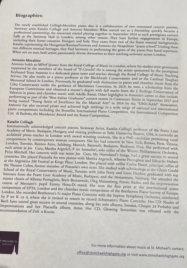 A quick swop over for a thank you to such an attentive audience allowed Antonio to be at the helm for a delicious ‘bon bon’ by Rachmaninov. A ‘Polka’ written for four hands which the composer had probably played with his friend Vladimir Horowitz!