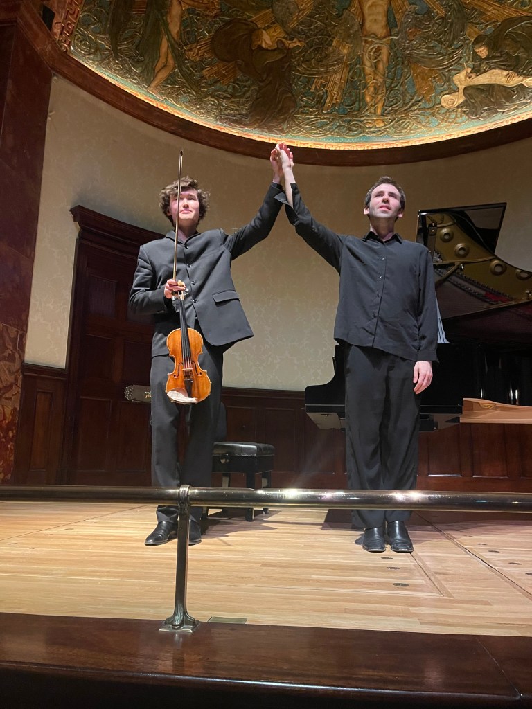 A potent combination that now in the interval I can contemplate what wonders I have just experienced. Grieg and Schumann sonatas played with overwhelming power and united burning intensity, combined with a poetic beauty of ravishing authority .To see Daniel on his 24th birthday lean back just as actors are told to do arching their back to appear even more imposing than they are in life ,but playing with the intensity of an Arrau, with real weight .Yes I know Arrau was a pianist but he more than any other knew what weight and intensity allied to interpretative mastery really meant. Kantarow with streams of notes just thrown off as if he too was playing a magnificent Strad. Such was their unity that the actual instruments became one glorious voice of a communicative mastery that reached every one of us in this sold out hall .The unified silence and tension was more palpable than I have ever felt with such intensity. in the concert hall. Now after the interval our two young heros arrive without the score because they have the music engraved in their being .The magic opening notes of the Franck played with a glowing luminosity answered by the whispered barely audible reply of the violin . A continual building of intensity until reaching an unbearable pitch of passionate dynamism that I have rarely experienced in the concert hall. Unbelievable virtuosity in the second movement that made the mellifluous outpourings such a relief, as we could feel this turbulent cauldron about to erupt again. And erupt it certainly did where suddenly Kantarow reduced the sound to prepare us for the breathtaking race to the final dramatic note. A recitativo played with audacious authority by both players but diffused with the simple ravishing beauty of the Allegretto. Chasing each other with pastoral ease until they caught up with each other and sparks really were ignited in a burning passionate outpouring of quite extraordinary potency.