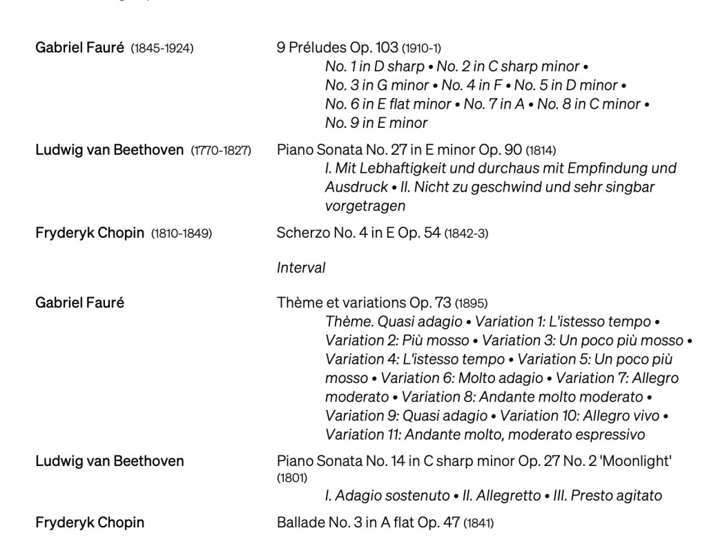 Chopin’s 3rd Ballade was so grotesque and exaggerated with a crowd pleasing flourish at the end that it belied the remarkable scholarly musicianship of his Fauré.