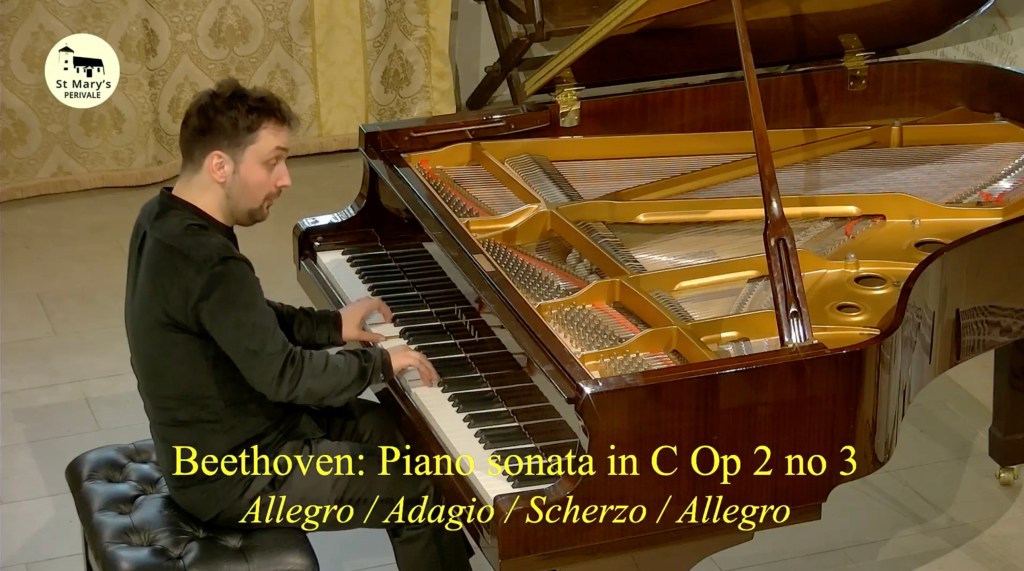 Op 2 n. 3 is notorious for its opening double thirds and I have seen Nikita Lukinov play it even with a helping hand from his left ! Cristian played it with gentle elegance with one hand and it was this return of the opening elegant declaration that was so touching after the dynamic outbursts of a Beethoven who was already feeling the vast canvas that was opening up from his heritage. Full robust sounds where every note had its just weight but without any hardness or brittle percussive brilliance.There was beauty too, with Beethoven’s beautiful mellifluous outpouring of Schubertian proportions. An architectural shape to this, the longest first movement of these first three sonatas. This is the first really important Sonata that became a favourite of the great pianists such as Arturo Benedetti Michelangeli and Claudio Arrau.There was a timeless beauty to an ‘Adagio’ of extraordinary poignancy and importance demonstrating the pupil breaking out of the shell of his teacher. There was a rhythmic insistence to the ‘Scherzo’ and an enviable sweep to the Trio.The ‘Allegro’ was played with infectious dance rhythm where the chords were played with a lightness and elegance that was quite remarkable for its shape and beauty. There was dynamic drive too that brought us to a tumultuous ending, but always within the sound world of Beethoven’s architectural mastery.