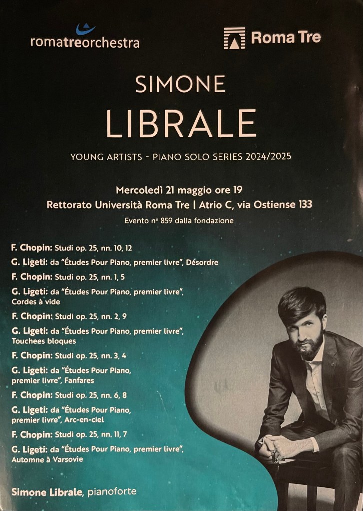 Simone Librale, ha studiato pianoforte all’ISSM “Pietro Mascagni” di Livorno sotto la guida di Daniel Rivera e Maurizio Baglini, conseguendo il diploma accademico con lode e menzione d’onore. Specializzatosi nel repertorio moderno e contemporaneo, ha proseguito gli studi presso l’Accademia di Musica di Pinerolo con Emanuele Arciuli e Ralph van Raat. Ha debuttato come solista con la Roma Tre Orchestra nel 2020, eseguendo il “Mozart Project” sotto la direzione di Sieva Borzak. Ha partecipato a festival di rilievo come il Bari Piano Festival, il Festiva Liszt e il Festival Luciano Berio. Nel 2022, ha eseguito la Quinta Sonata di Salvatore Sciarrino al Teatro Verdi di Pordenone, ottenendo il plauso del compositore stesso. Nel 2023, ha partecipato alla prima mondiale di “11.000 Saiten” di Georg Friedrich Haas al Bolzano Festival Bozen. Nel 2024, ha tenuto un recital trasmesso su Rai Radio3 per “I Concerti al Quirinale,” eseguendo la Sonata n.2 di Charles Ives, ricevendo ampi consensi. Ha frequentato masterclass con Pierre-Laurent Aimard, Louis Lortie e Andrea Lucchesini.