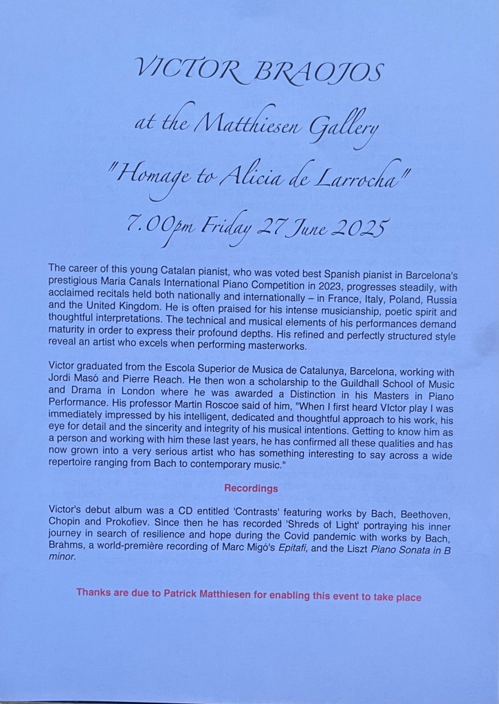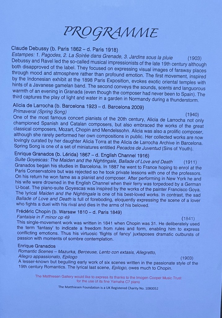 A beauty of diction that made the song sheet superfluous especially when the pianist could highlight and illuminate even the tinkle from a stray mobile!