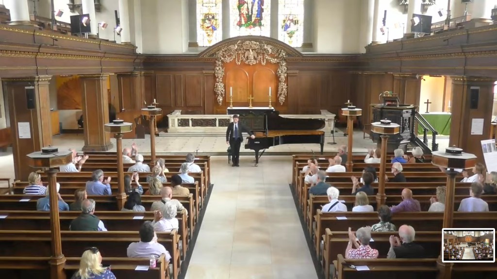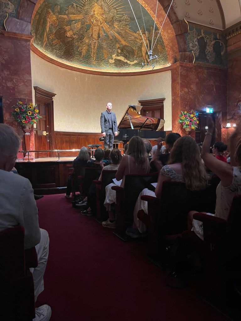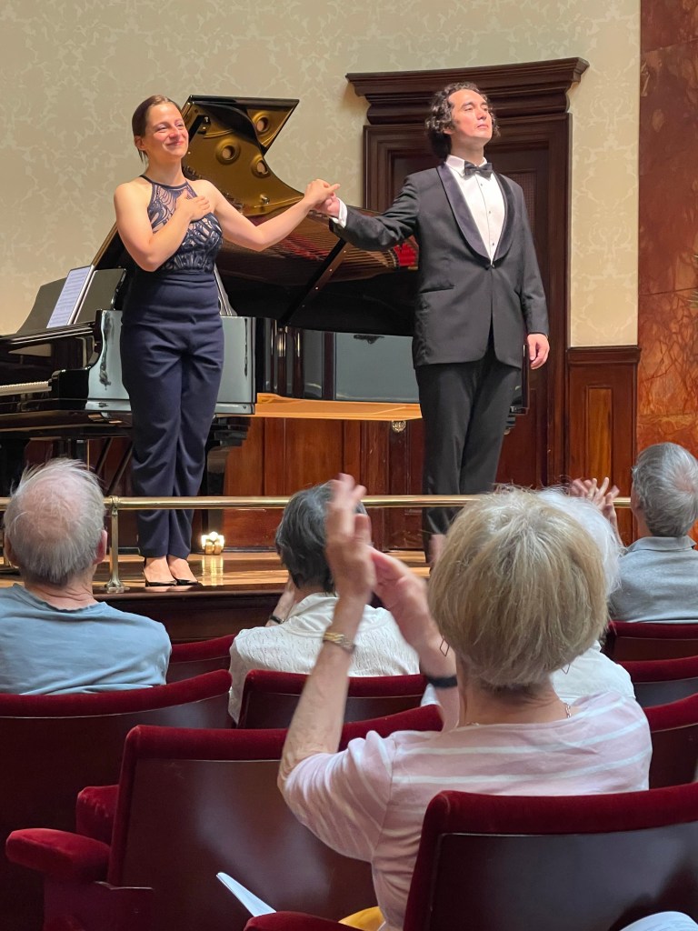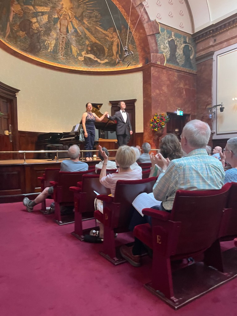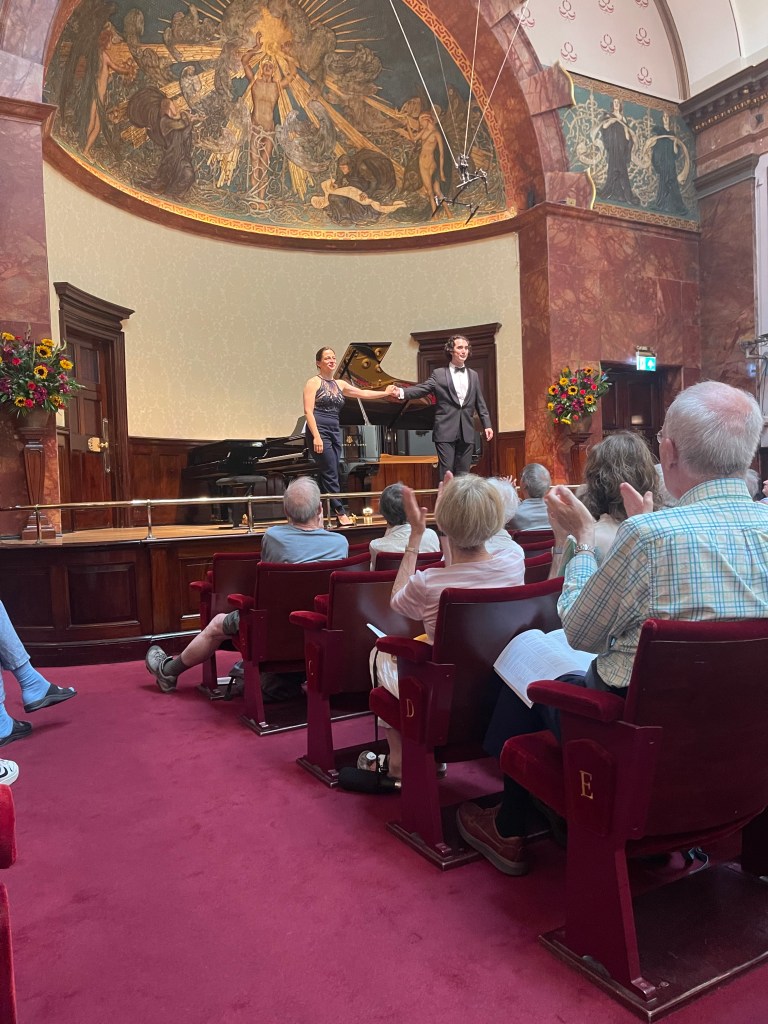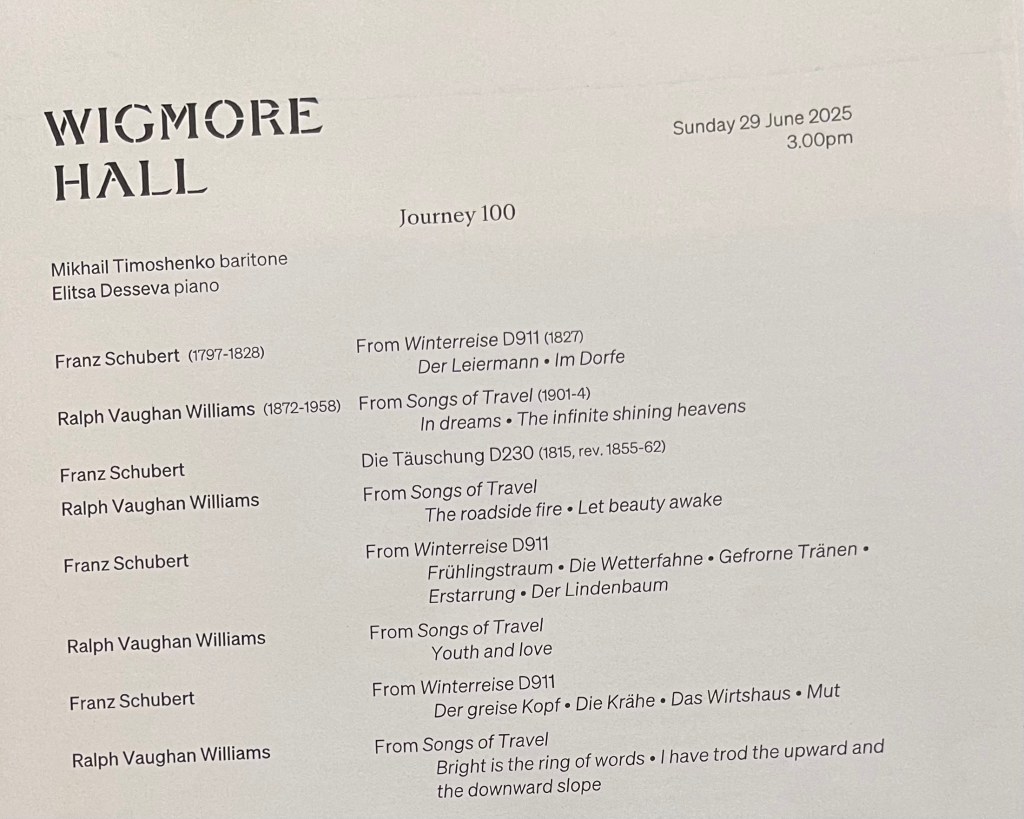 What a relief to shelter from the sweltering heat and spend an hour with music of such radiance and beauty from a husband and wife dream team . A moving mixture of Schubert ‘Winterreise’ and Vaughan Williams ‘Songs of Travel’ .