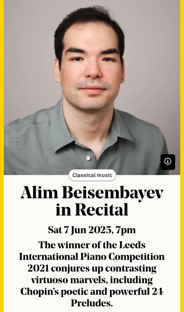 The 27-year-old pianist Alim Beisembayev has planned a magnificent array of music for his recital. Beginning with an energetic sonata by Scarlatti and Ravel’s hypnotically beautiful Valses Nobles et sentimentales, he moves on to Liszt’s powerful evocations of hell and redemption in the fantastical sonata Après une lecture du Dante, plus Ligeti’s most celebrated Etude, ‘The Devil’s Staircase’.The second half begins with Cwicseolfor(Quicksilver), a new work by the Jamaican-British composer Eleanor Alberga, written for Isata Kanneh-Mason and premiered in Budapest as part of a European concert hall tour in 2021. Now, at last, it gets its Southbank Centre premiere under the fingers of Beisembayev, who has become a significant advocate of Alberga’s music. Last year, Beisembayev gave the world premiere of Alberga’s Piano Concerto, which was commissioned for him as part of his prizes at the 2021 Leeds International Piano Competition.The concert sweeps to a close with Chopin’s 24 Preludes, each one a poetic miniature full of visionary imagination.