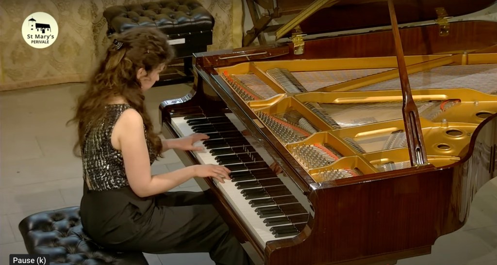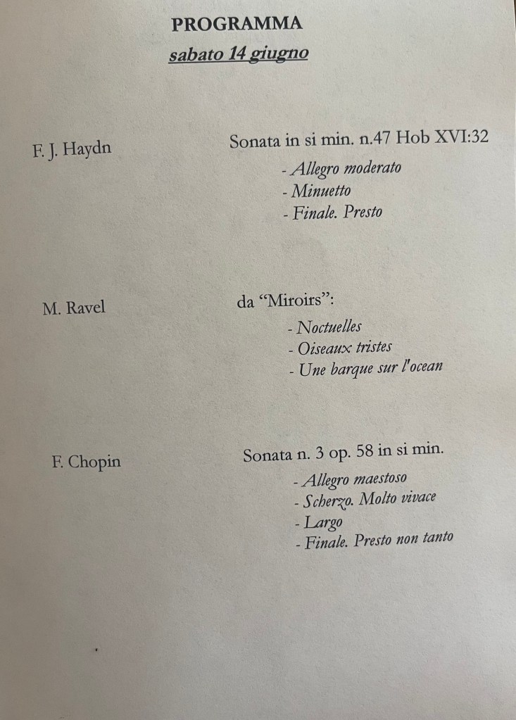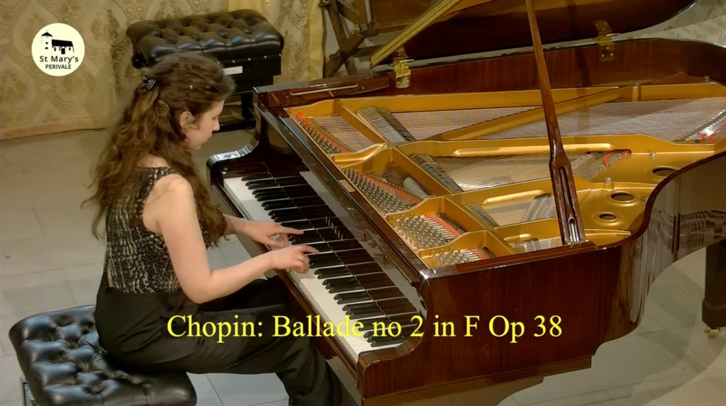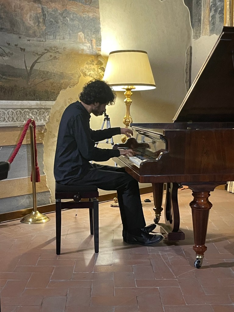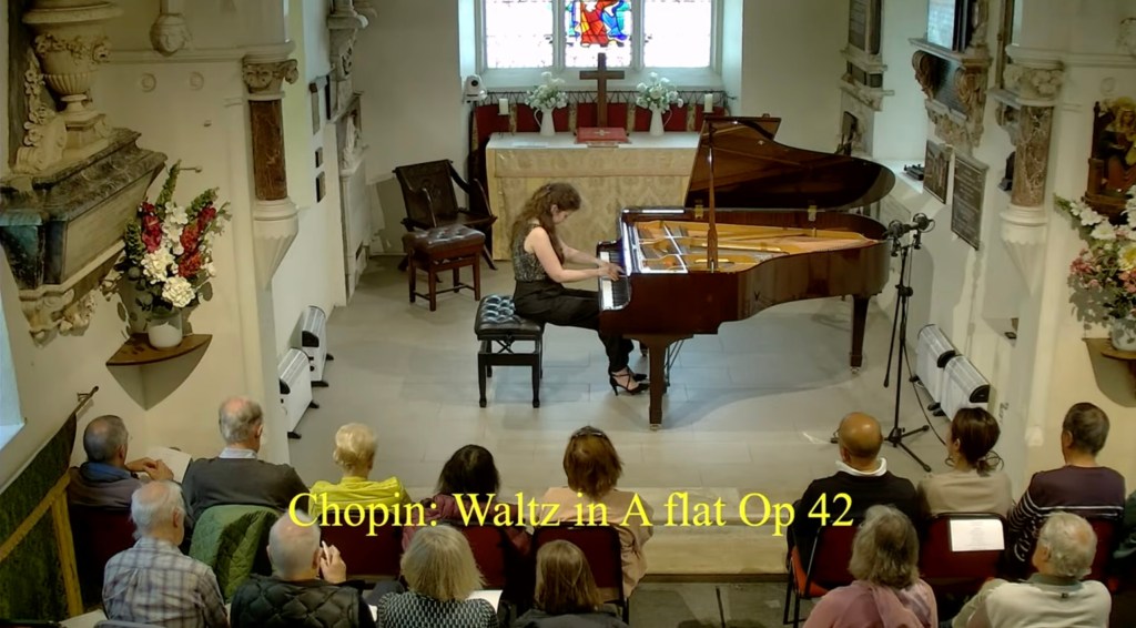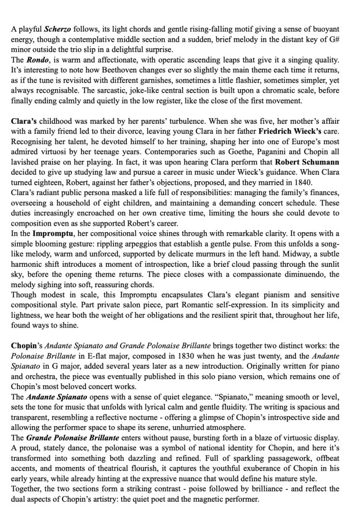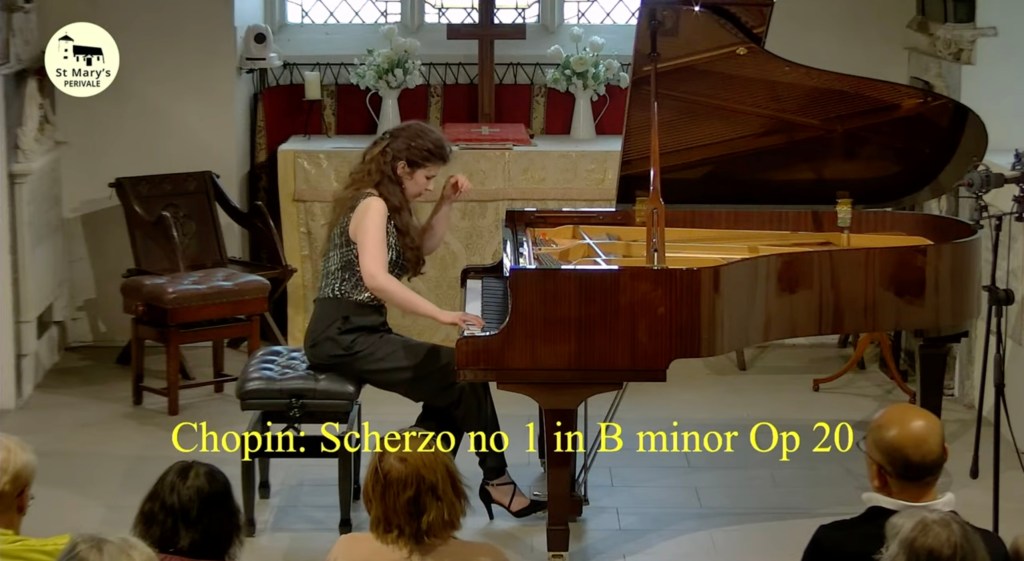 ‘ Some beautifully crafted playing of great intelligence.Her Mozart was simple and beautiful with sparkling playing of great weight.Playing of great poise in the slow movement of aristocratic beauty.The last movement sprang from her agile fingers with a ‘joie de vivre’ that was of great rhythmic energy and finesse. The Chopin Variations op 2 are the ones that Schumann on hearing Chopin play them in Paris was to remark ‘Hats off a genius’.A very well prepared performance of great musicality and intelligence where the technical difficulties were incorporated into a musical shape of beguiling style.A jeux perlé that flowed with teasing ease from her agile fingers.A fine performance that just missed the charm and grace of a show piece written especially as a visiting card for the young Chopin as he played in the Salons of the aristocratic Parisian families of his day.’ Christopher Axworthy Florence October 2023