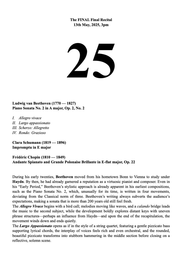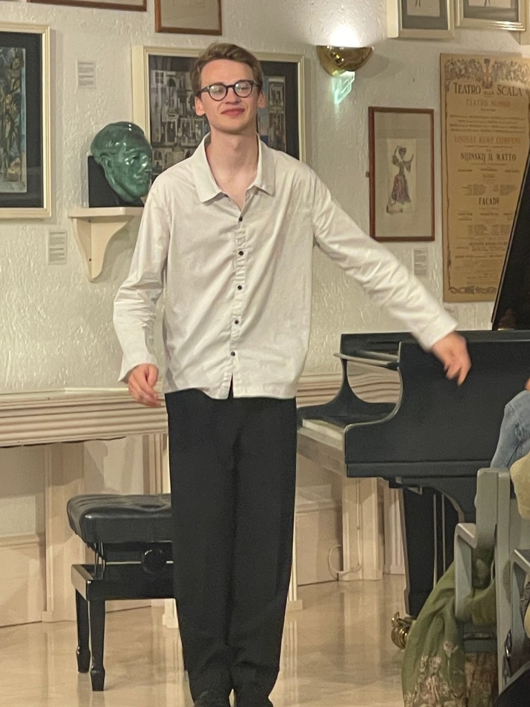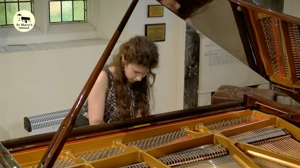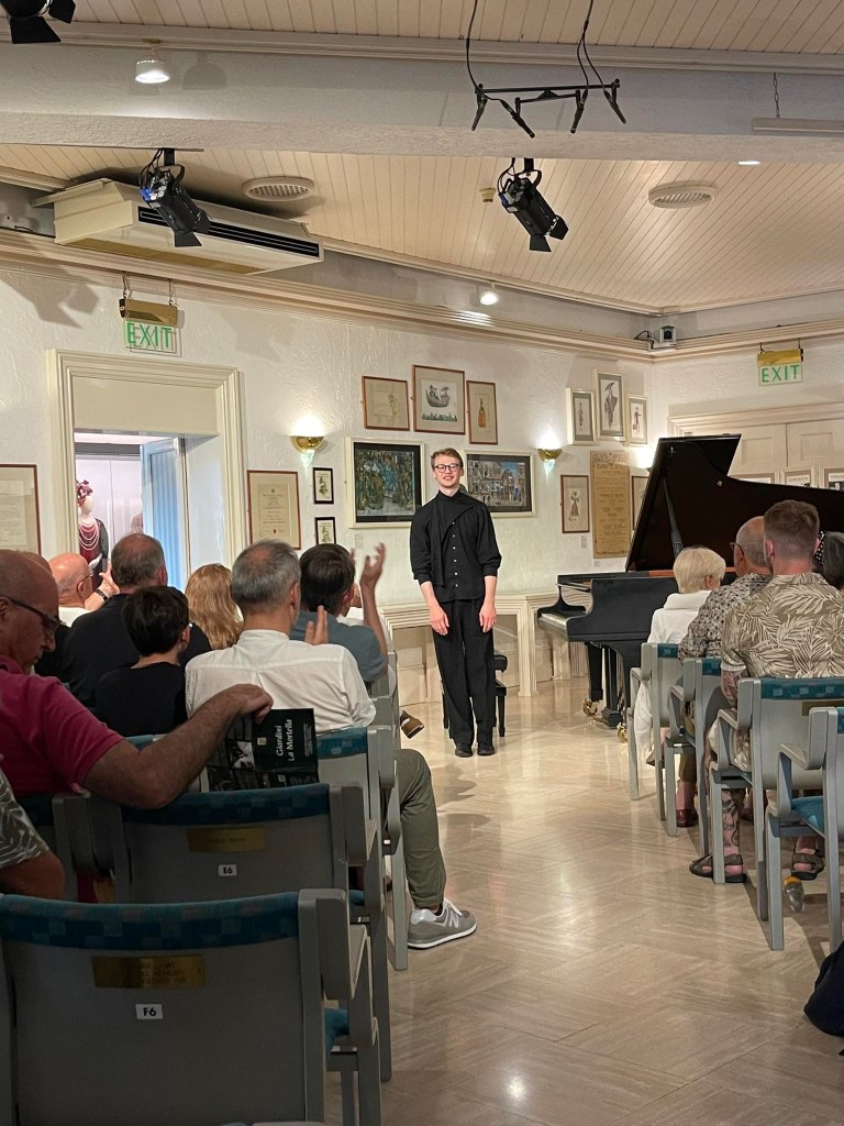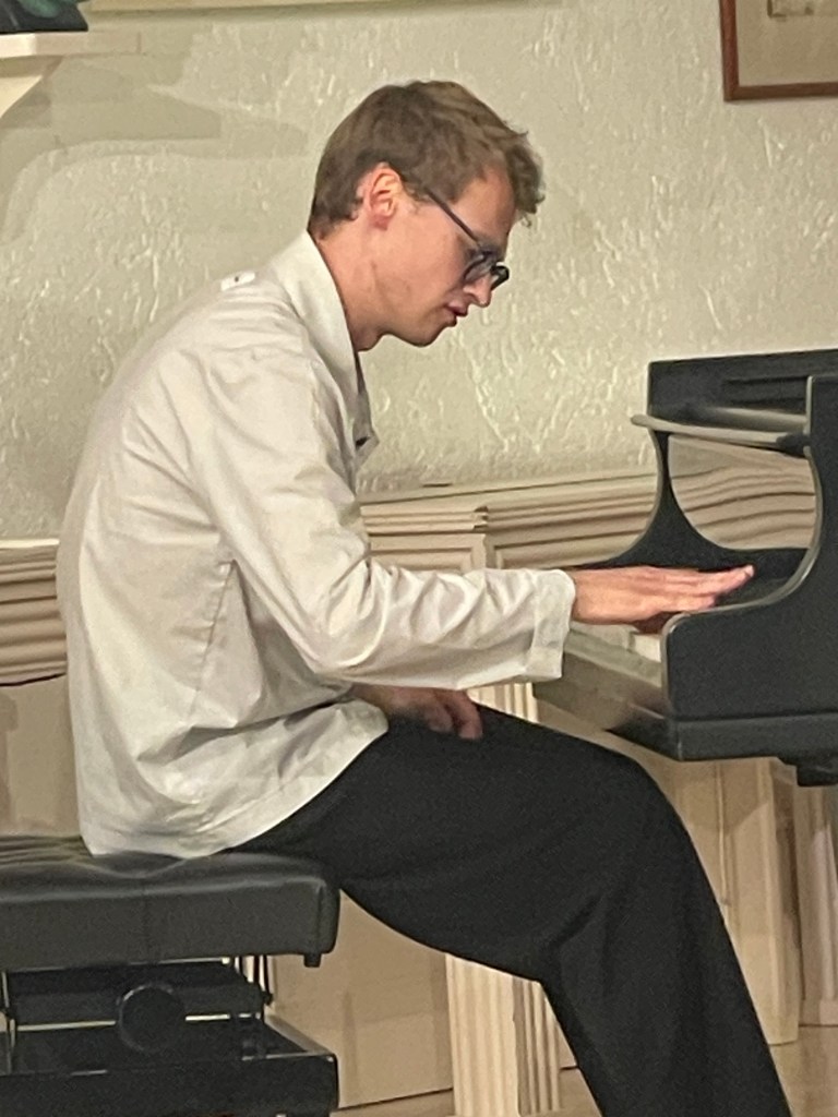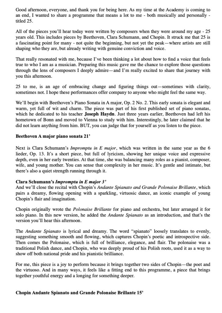 ‘ Some beautifully crafted playing of great intelligence.Her Mozart was simple and beautiful with sparkling playing of great weight.Playing of great poise in the slow movement of aristocratic beauty.The last movement sprang from her agile fingers with a ‘joie de vivre’ that was of great rhythmic energy and finesse. The Chopin Variations op 2 are the ones that Schumann on hearing Chopin play them in Paris was to remark ‘Hats off a genius’.A very well prepared performance of great musicality and intelligence where the technical difficulties were incorporated into a musical shape of beguiling style.A jeux perlé that flowed with teasing ease from her agile fingers.A fine performance that just missed the charm and grace of a show piece written especially as a visiting card for the young Chopin as he played in the Salons of the aristocratic Parisian families of his day.’ Christopher Axworthy Florence October 2023