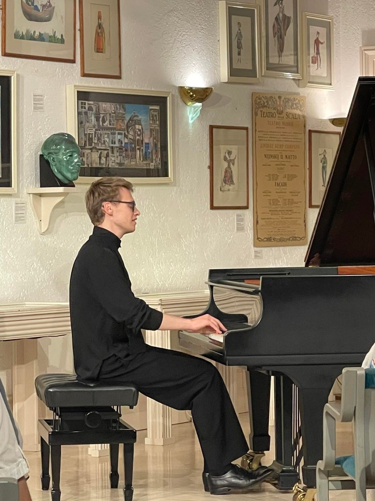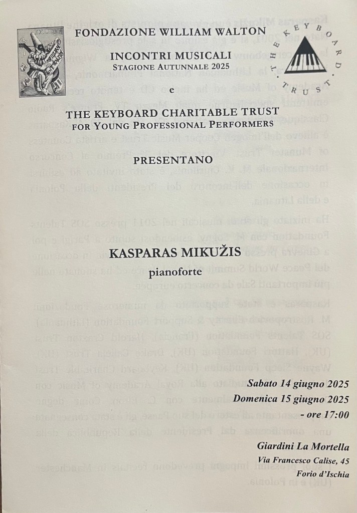Kasparas opened his first programme at La Mortella on Ischia with the Sonata in B minor n.47 Hob XVI:32. Having chosen the older of the two Steinways that sit in the music room created by Susana Walton next to her husband’s studio. It is a concert hall created to give a platform to gifted young musicians, who after years of perfecting their art, need an audience with which to share their artistry, allowing it to mature, flourish and flower as everything seems to do on this sceptered isle. Pianos ,like good wine ,mature with age and it was this maturity that Kasparas brought to all he played. Having spent the past six years at the Royal Academy in London under the eagle eye of Christopher Elton, his sense of style and innate musicianship has been nurtured by this renowned mentor of pianists, passing on his heritage from Tobias Matthay and Gordon Green not forgetting the enormous influence of Guido Agosti and Maria Curcio.