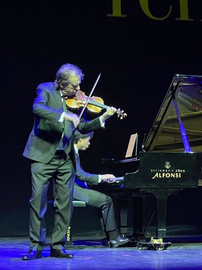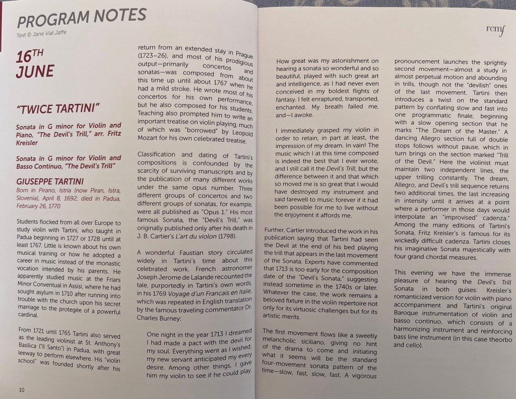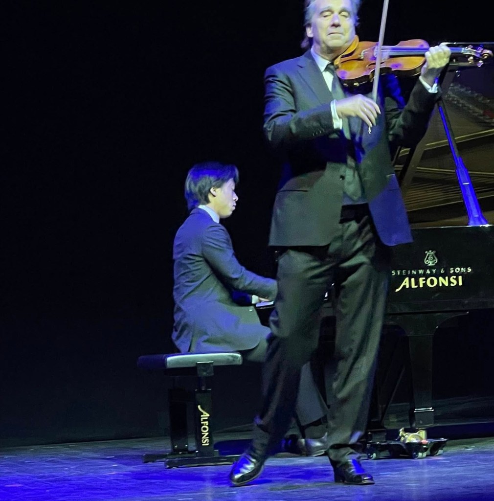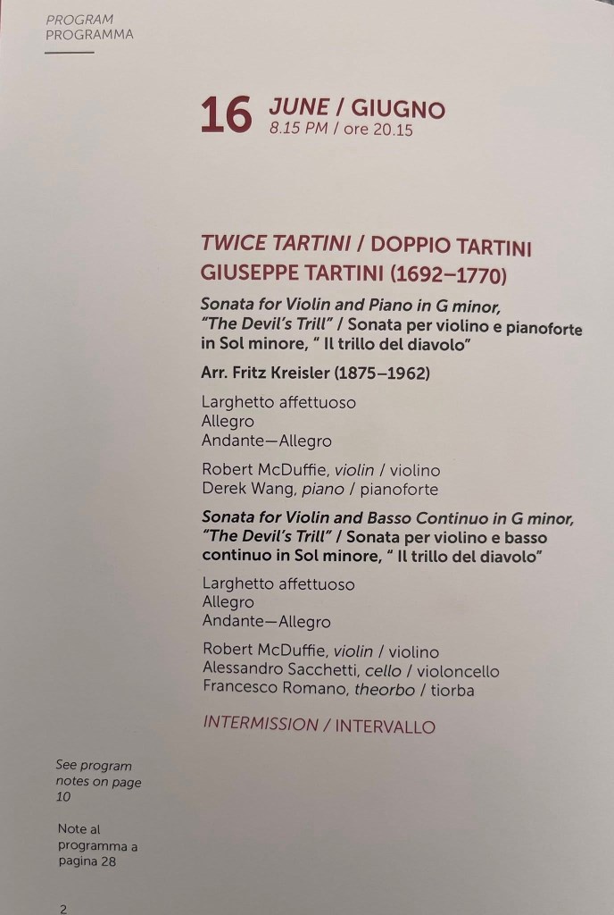 Two performances of the Devil’s Trill one in the romanticised version with piano by Kreisler. A monstrous cadenza characterises a performance where the interplay between the sumptuous violin ,which I imagine from the wondrous velvety sound that it must be of a similar vintage, and the superbly discerning pianistic high jinks from Derek Wang’s noble hands. An interplay that was discreet, but not too much so, as his Ravel Trio will no doubt show us in the second chamber music evening.