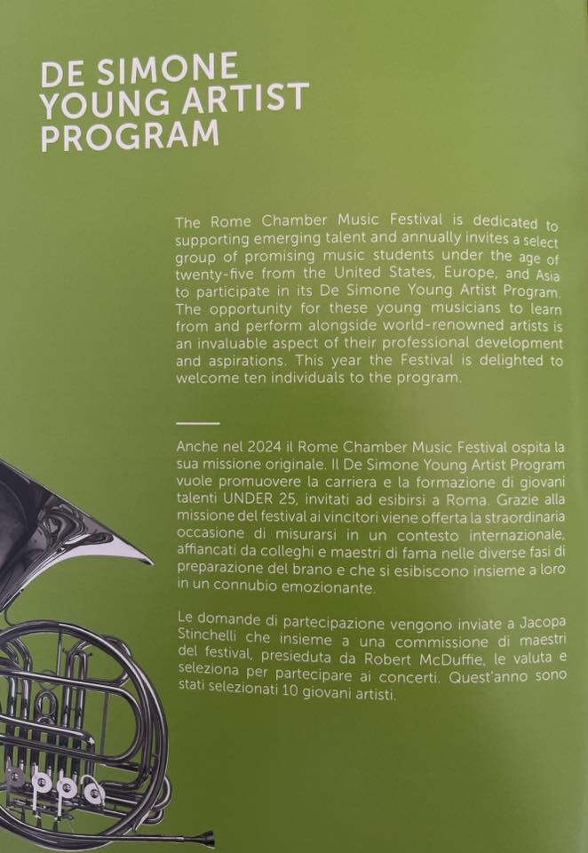 An eclectic programme for real connoisseurs with the opening night dedicated to the founders of modern day music of the 15th and 16th century. A Devil’s Trill played by the devilish master who had founded this festival in 2003 with the intent of bringing not only masterpieces to the attention of the Eternal City. Above all bringing remarkable young musicians to share their enthusiasm and exhilaration together via The Steven Della Rocca and De Simone Young Professional Programmes.