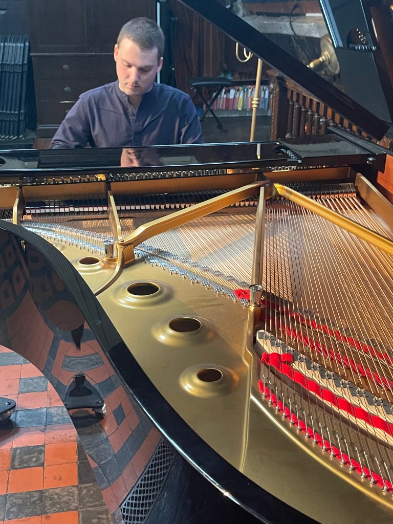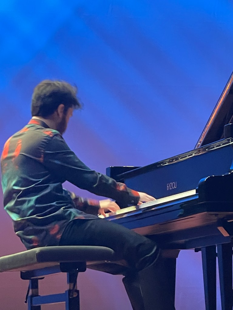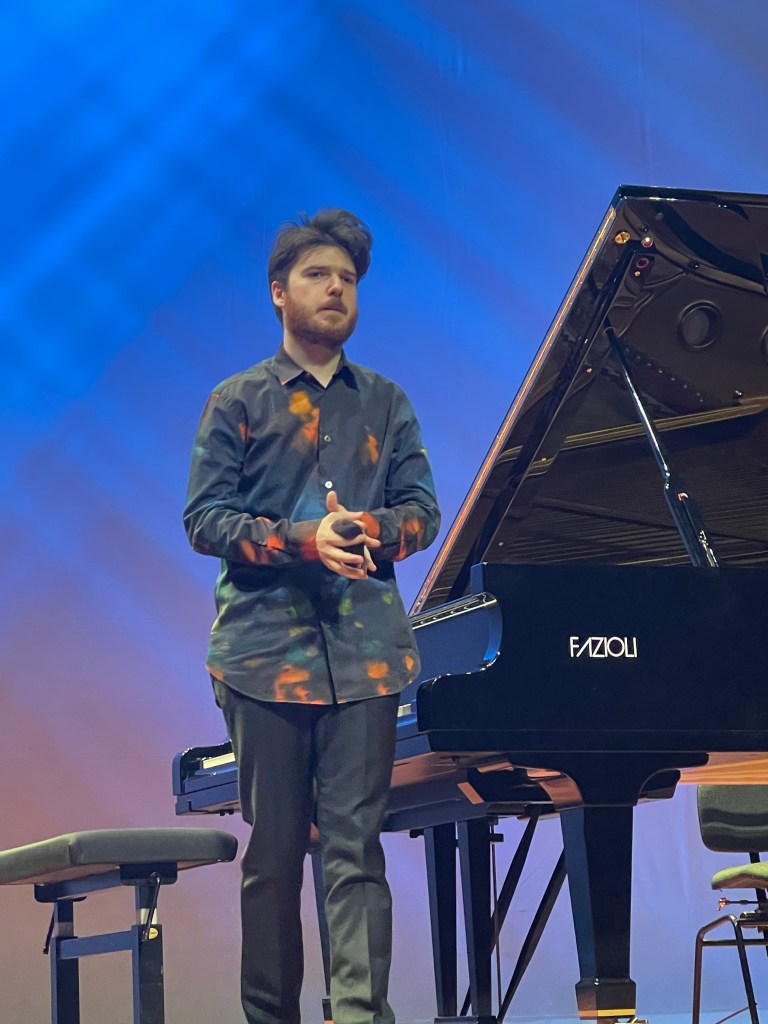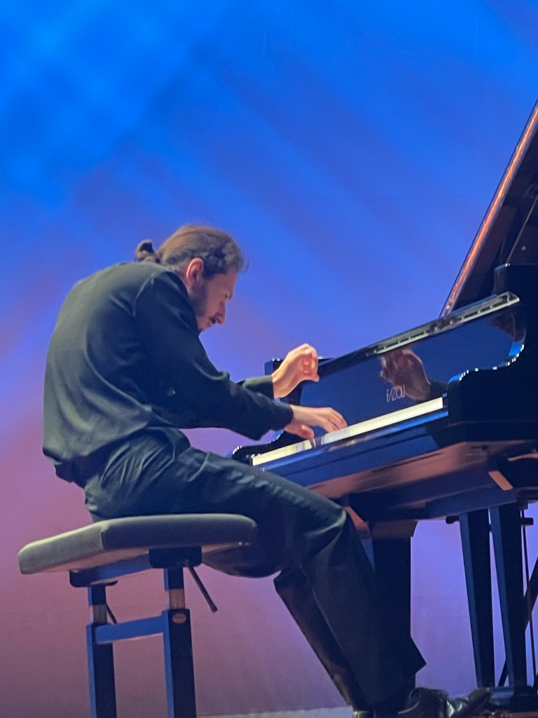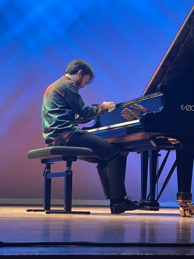 Many beautiful things in the Schumann but I found he had not judged the acoustic and a lot of the faster passages were played often too fast to allow any breathing and were rather hazy and indistinct. It was however exactly this orchestral use of the pedal that illuminated his Brahms which I have rarely heard played with such sumptuous rich sound and real Brahmsian drive. As I said to him afterwards ,as the lads were off to have a sandwich together , you made that Fazioli sound like a sumptuous Bosendorfer, which is no mean feat !