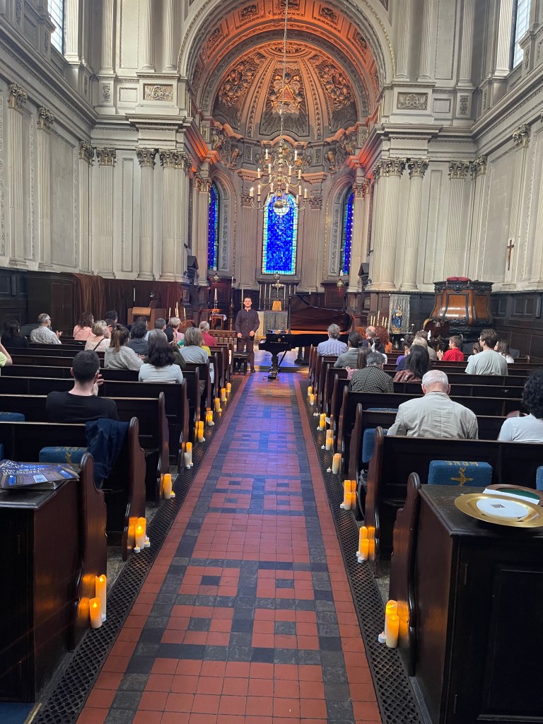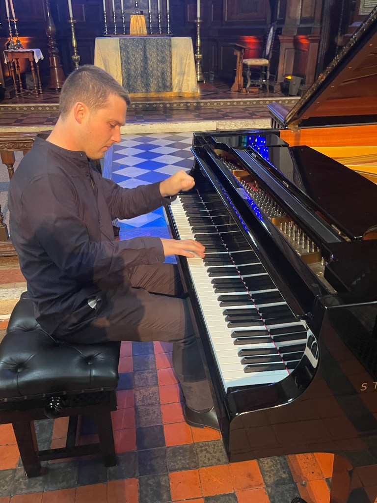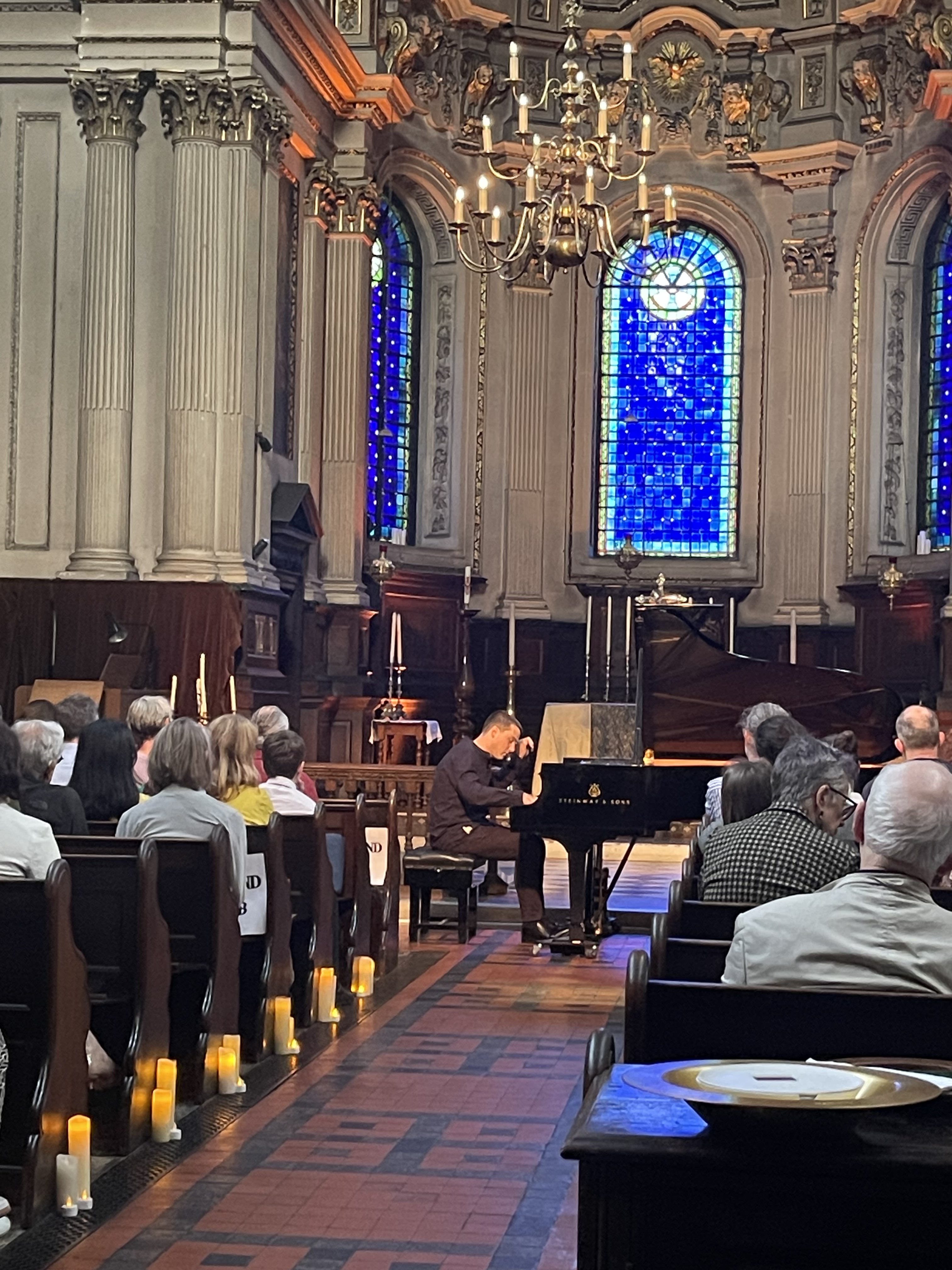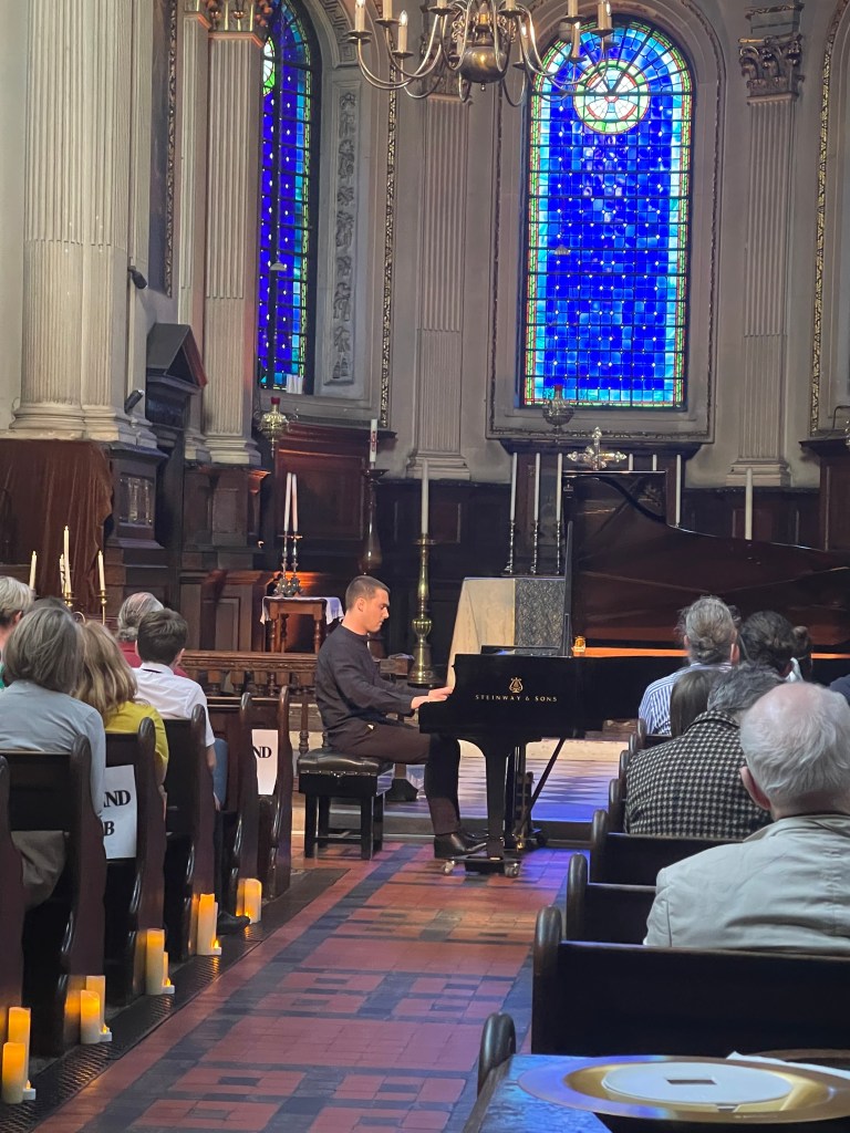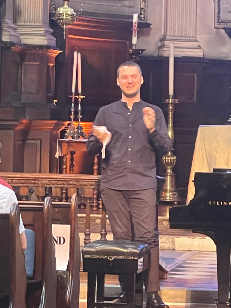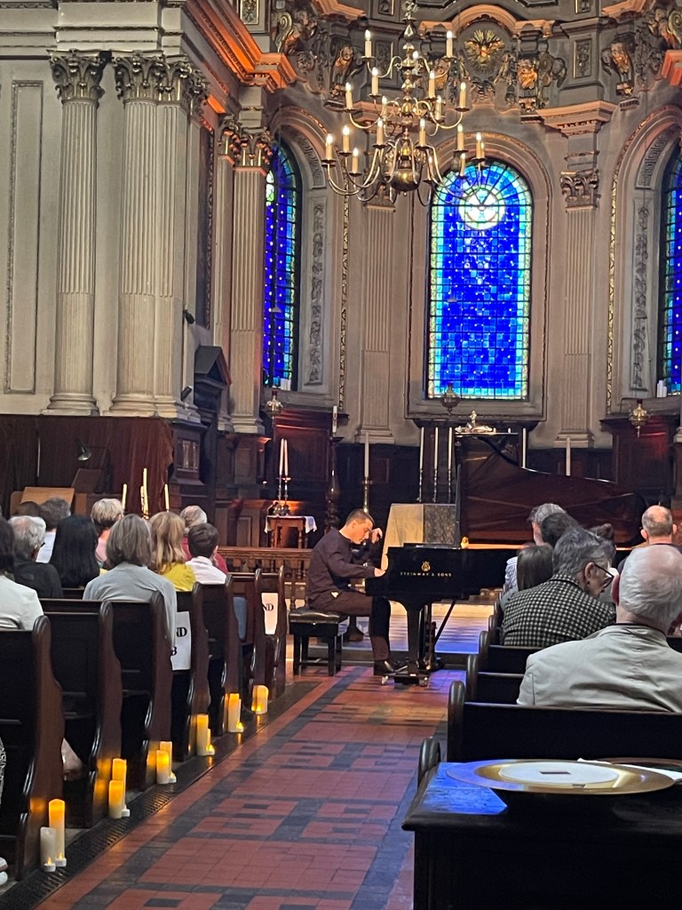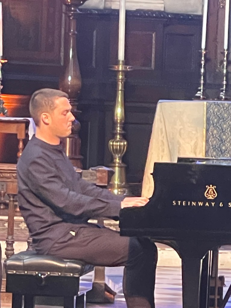 Phillip played it as a whole with beauty and a sense of style with a languid freedom and refined rubato. From the very first notes ‘einfach’ where the radiance of the melodic line was allowed to fill every corner of this beautiful church with a glowing luminosity. Rapid changes of tempo and character were played with brilliance and a superb sense of balance that allowed the melodic line to shine above all the intricate counterpoints that Schumann commands. Schumann even writes on three staves to show just where the melodic line lies but Phillip throughout the work was able to steer his way so clearly with poetic fantasy and above all ravishing sound.The Intermezzo of ‘Einfach und zart’ was played at quite a pace but even the single notes that become octaves were incorporated into the musical conversation that was driving us inexorably forward.. The melodic line that shone out in ‘Mit einigem Pomp’ was one of those magic moments where Phillip created a wash of sound and could allow the melodic line to emerge in its midst. The final episode ‘Zum Beschluss’ was played with beguiling nostalgia but also with a remarkable legato that allowed this great song to resound with all its most intricate counterpoints. The Allegro final flourish was played with aristocratic grandeur and sumptuous rich sound.