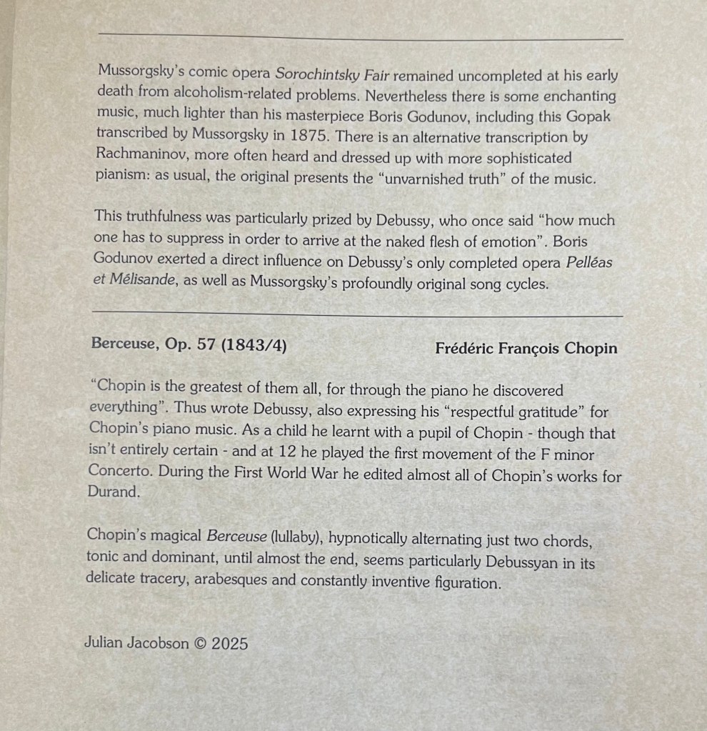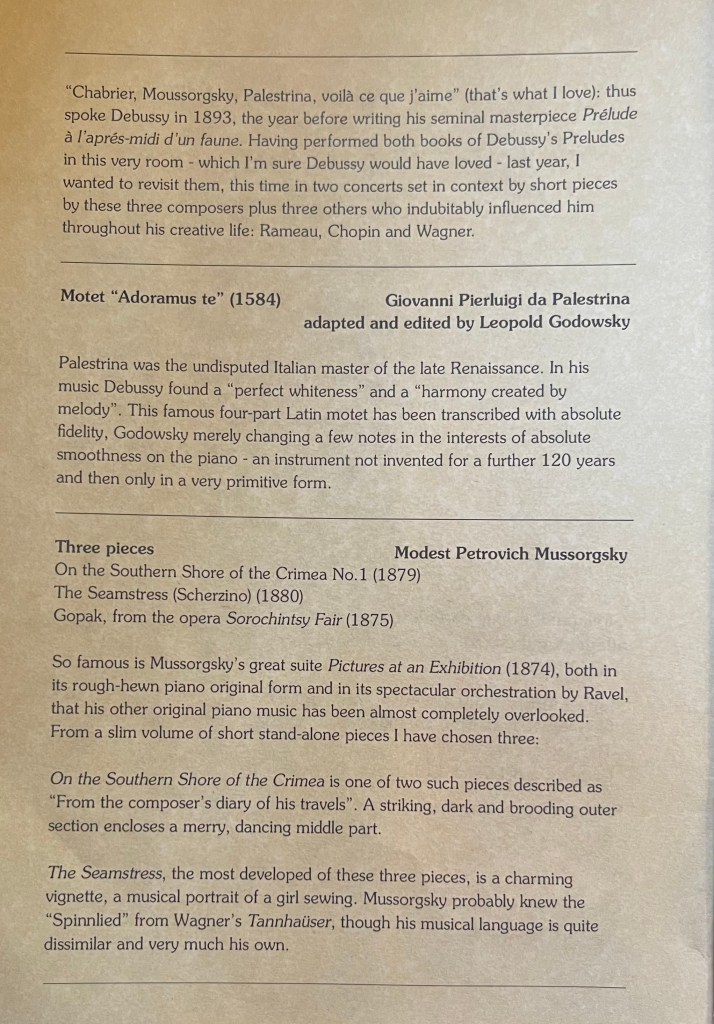 The remarkable Julian Jacobson ready to show us the path that led to the creation of twenty four of the most extraordinary visions of Claude Debussy. Starting the journey with the Motet ‘Adoramus te’ by Palestrina adapted for piano by Godowsky with the just respect that the founder of modern day music deserves . Followed by three short piece by Mussorgsky and ending with the ‘Berceuse’ by Chopin. Adding to the published programme two Arabesques by Debussy to make up a programme with an interval . Following with the 12 Preludes Book 1 played by a true kapellmeister who carries in his head the entire piano repertoire .