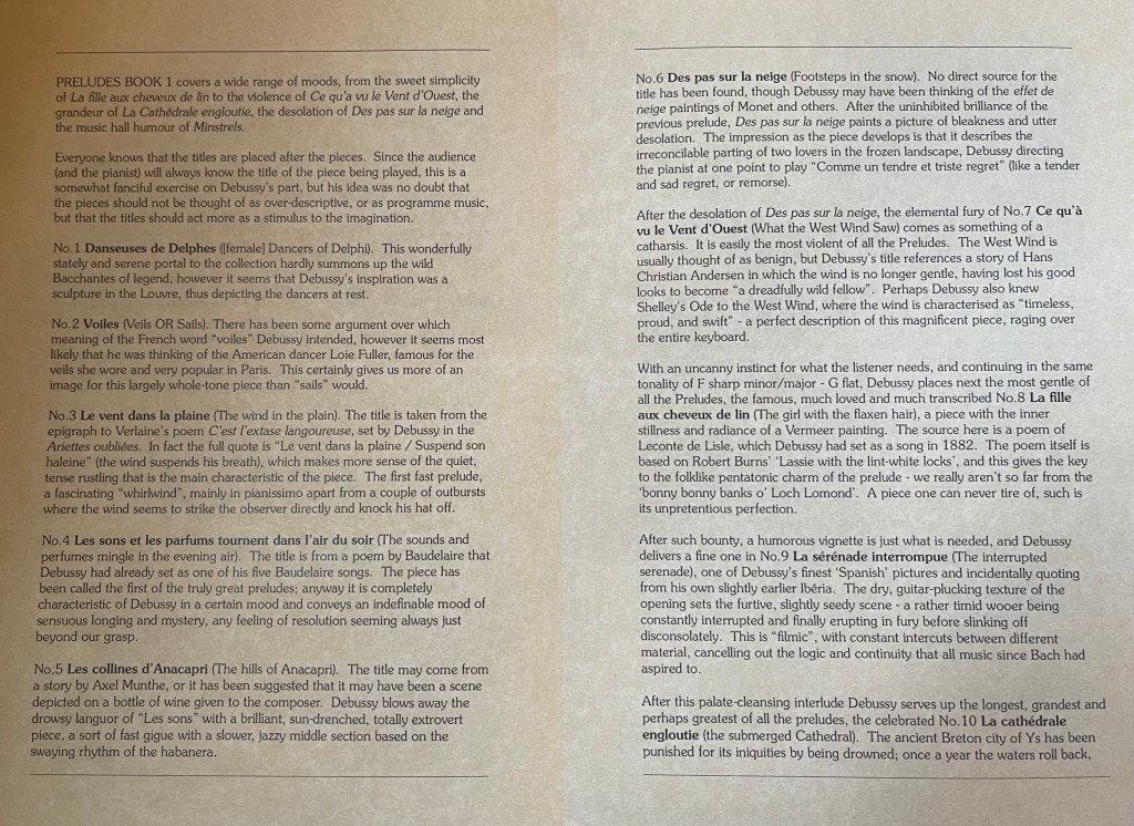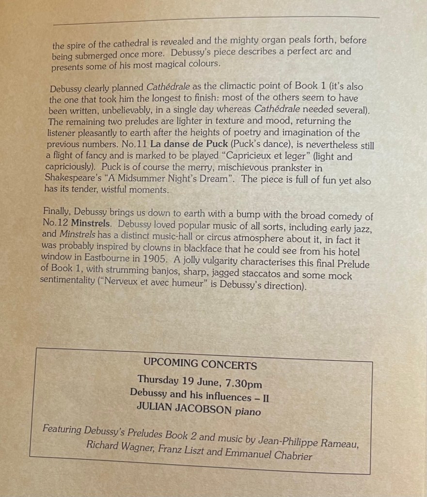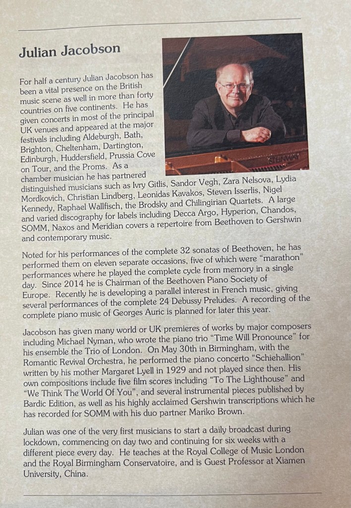 The preludes I had written about just a year ago but it was fascinating to hear the works that had influenced the writing of them. Prof Jacobson’s programme notes speak for themselves and realising at the last minute that there was an interval he happily added some more works to his programme .