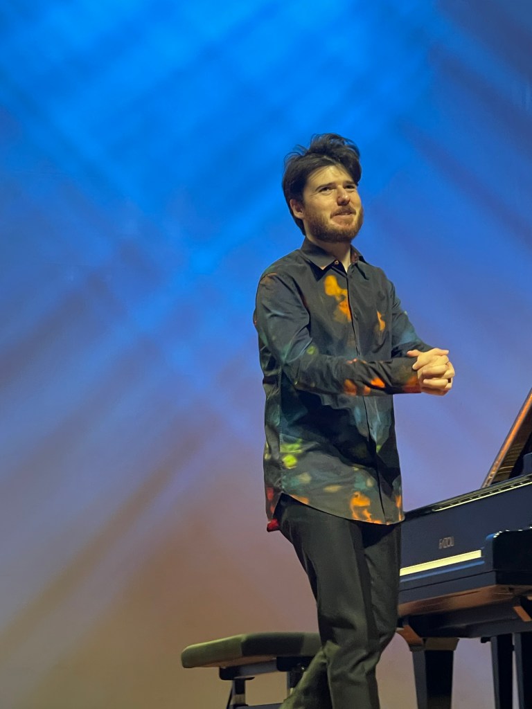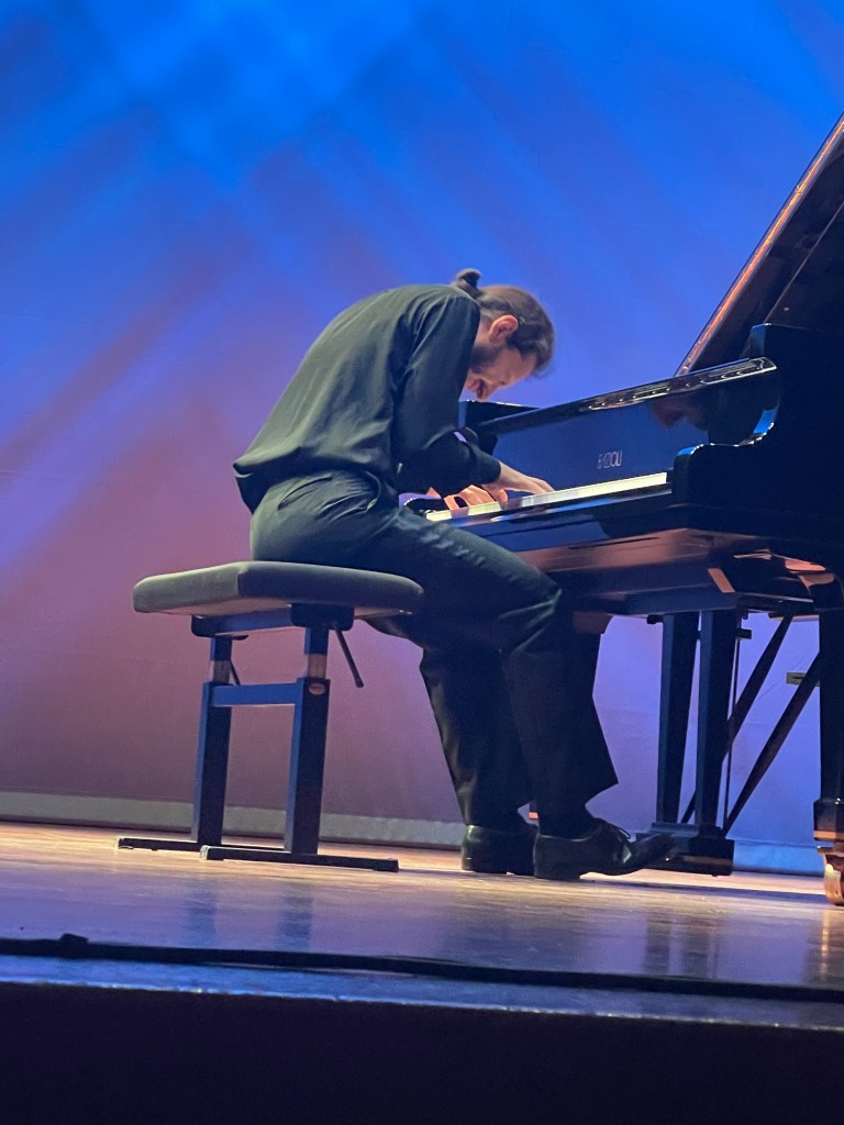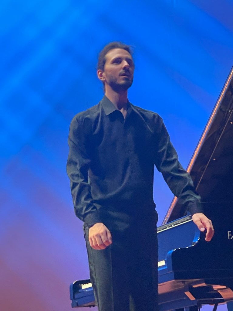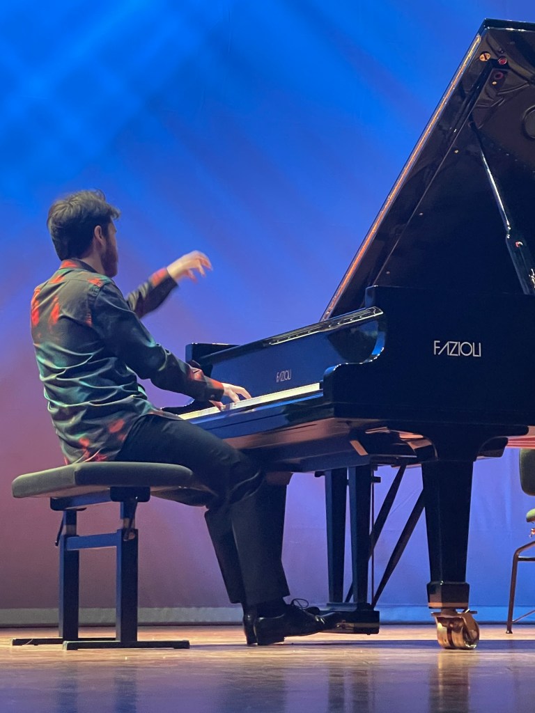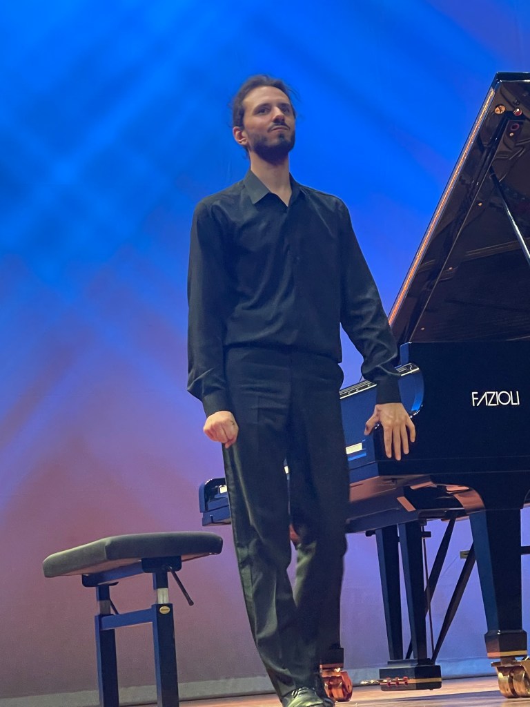 Nicolas Giacomelli placing the two set pieces at the beginning and end of his programme that included Schumann Kreisleriana and Brahms Seven Fantasie’s op 116. Playing the two set works without the score with total commitment and remarkable poetic fantasy showing a real understanding for a world tainted by Ginasterian gymnastics but also beguilingly insinuating sounds. The Mozart Fantasy in D minor was a little too slow and deliberate for the improvisation that it obviously is.Played with great poise and beauty of sound adding some delicate embellishments tastefully but in my opinion unnecessarily .The cheeky one in the left hand almost had me smiling out loud – I loved it almost as much as he obviously did.
