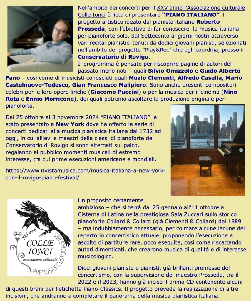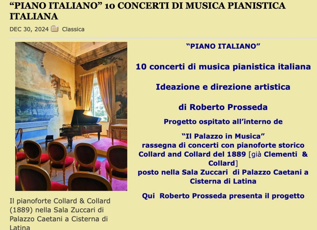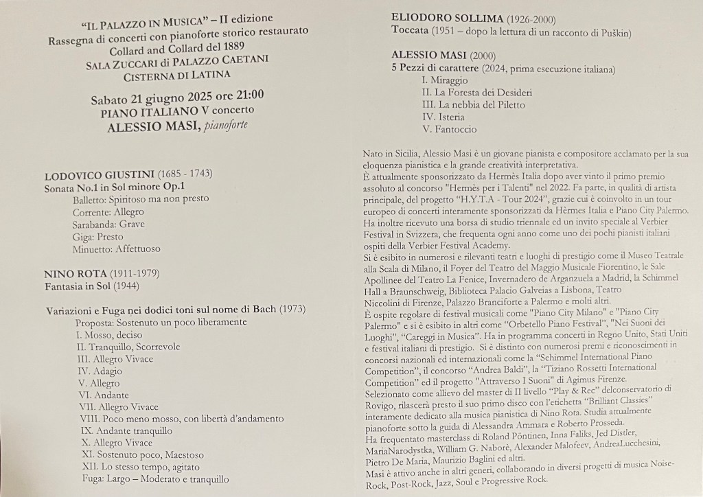 A Collard and Collard piano of 1889 that once stood in the Savoy Hotel in London but above all a masterly Sicilian pianist playing not only his own compositions but even more importantly the works of Nino Rota. Justly famed for his film scores but his classical compositions are practically unknown .