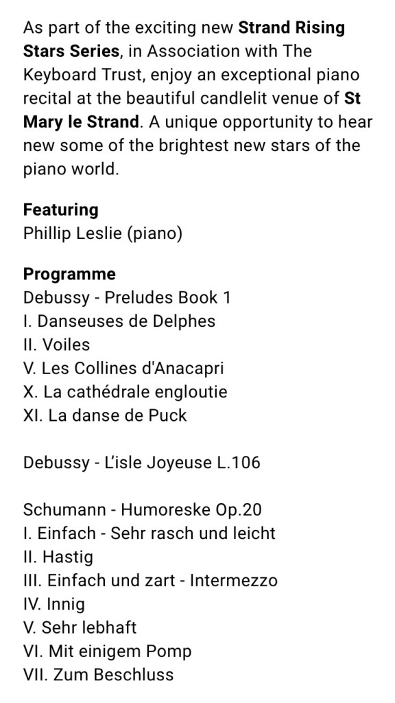Phillip Leslie proved himself to be indeed a rising star with Debussy Preludes of ravishing sounds and refined musicianship. Followed by Debussy’s vision of Jersey from Eastbourne with a tone poem of unimaginable passionate persuasion . But it was the sublime Humoreske of Schumann that filled these majestic walls with sounds worthy of this beautiful edifice. Florestan and Eusebius were at last united in the celebration of sublime beauty in the hands of a refined poet of the keyboard. A single encore of Paderewski’s Minuet in G was a homage to his teacher the renowned pianist Philip Fowke who was there to pass on the baton to a worthy successor.