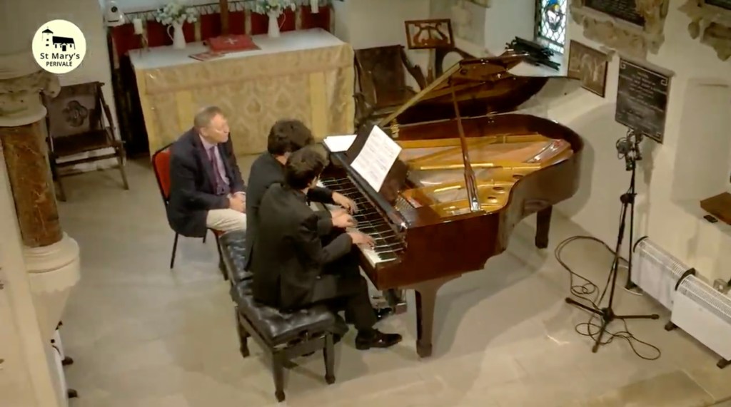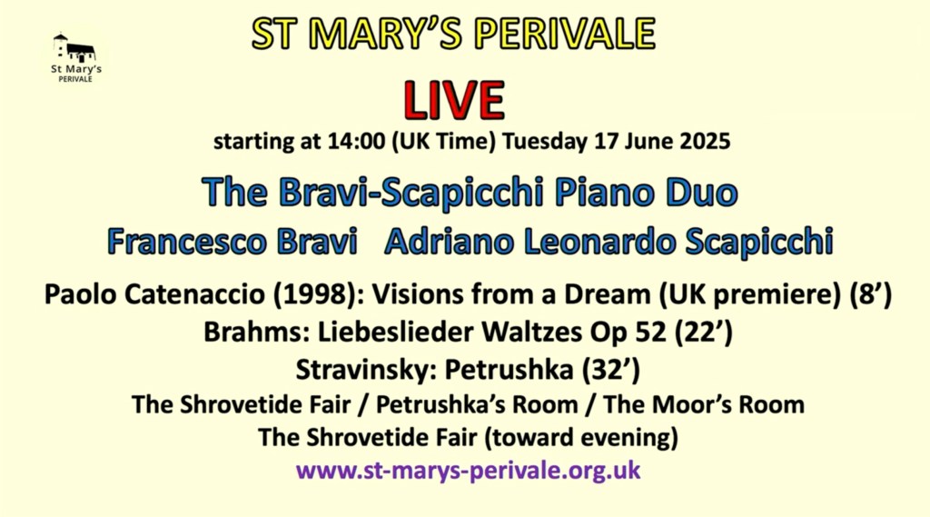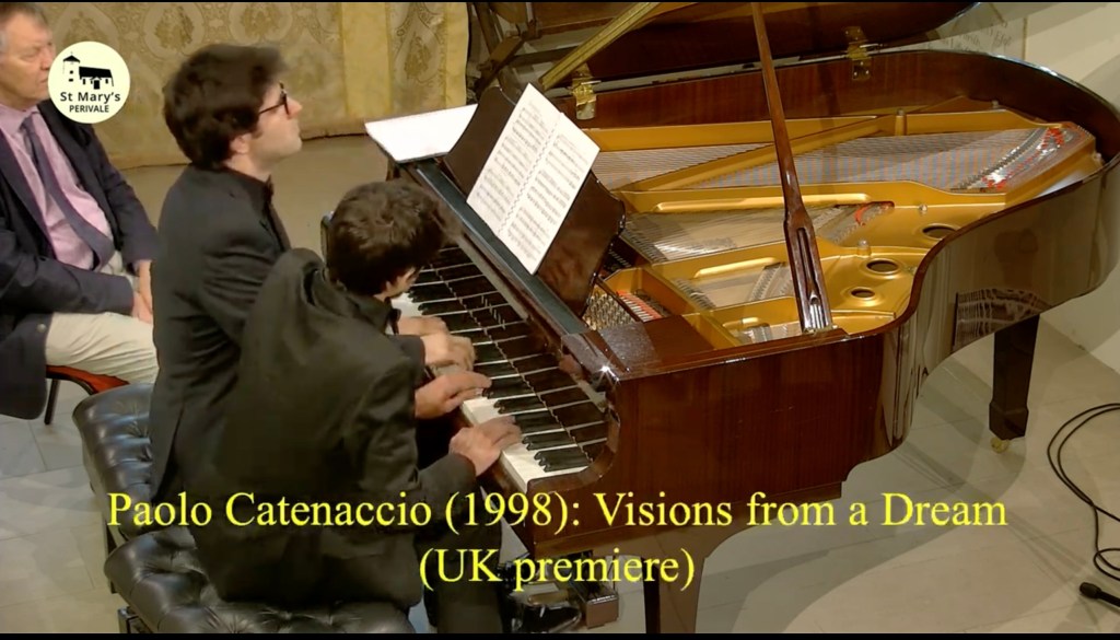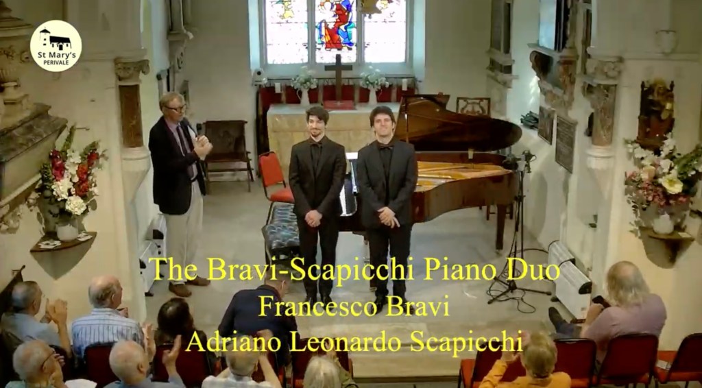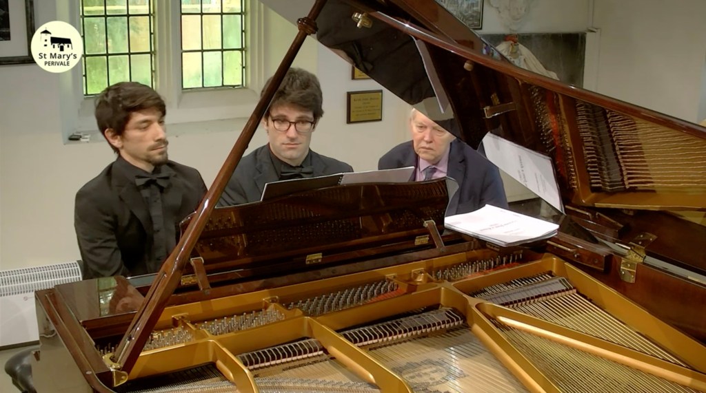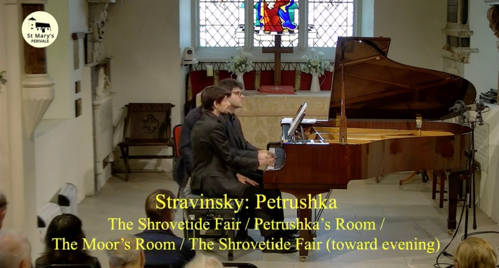 The colours and chameleonic changes of character were reminiscent of this duos ‘Rite of Spring’ from last season. A Stravinsky of remarkable clarity and Boulezian precision but also of an extraordinary self identification with this exotic world of Diaghilev and his Russian Dancers that were to take Europe by storm in the early twentieth century. My old teacher Guido Agosti had made a piano reduction of three pieces from the Firebird Suite, in 1928, which is a brilliant tour de force only for fearless virtuosi .This version for piano duet , which I imagine is original for ballet rehearsals, was even more overwhelming as we watched incredulously Adriano trespassing, with Francesco passively knowing there was nothing to do but join in the battle! It is 35 degrees in Rome from where I was able to watch this superb live stream but I got the impression it was much hotter in Perivale this afternoon !