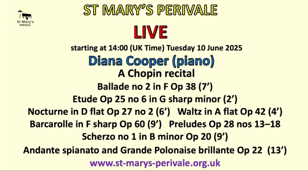 The Andante Spianato was played with a superb sense of balance and poise with a beguiling flexibility of aristocratic good taste. It was the same radiance and beauty that she was to bring to the encore of the Berceuse that followed the ovation that she received after a breathtaking account of the Grande Polonaise brillante. Suddenly Diana seemed to unleash her control and poise and let her whole body command the stream of notes that Chopin fills this early show piece with. A work that was to astonish the Parisian Salons of the day and had Schumann declare ‘Hats off, Gentlemen, a Genius’. Chopin had arrived and as Diana showed us today is here to stay illuminating and enriching our lives for ever more.