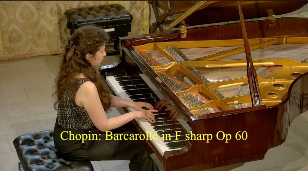The Barcarolle op 60 is surely one of Chopin’s most beautiful creations, a continuous song from beginning to end. From the opening deep C sharp in the bass that just opens up the resonance of the piano without any hardness there is a continual crescendo of radiance and beauty which leads to the final passion and aristocratic nobility that Diana played with rare control and understanding .Even the magical final bars ,so admired by Ravel, were part of this great song that finished as it began with octaves of radiance and purity from a sensitive artist, who had understood the extraordinary architectural shape and poetic content from this Genial master of the keyboard.