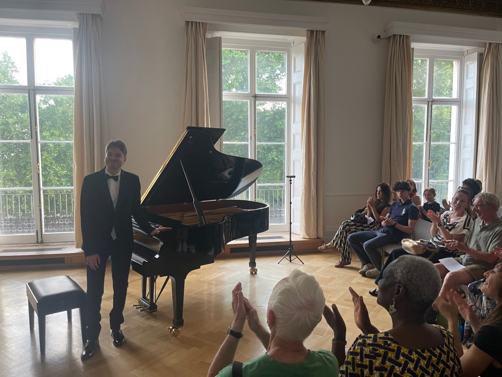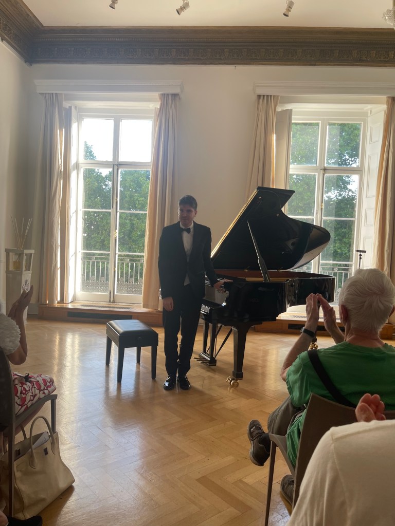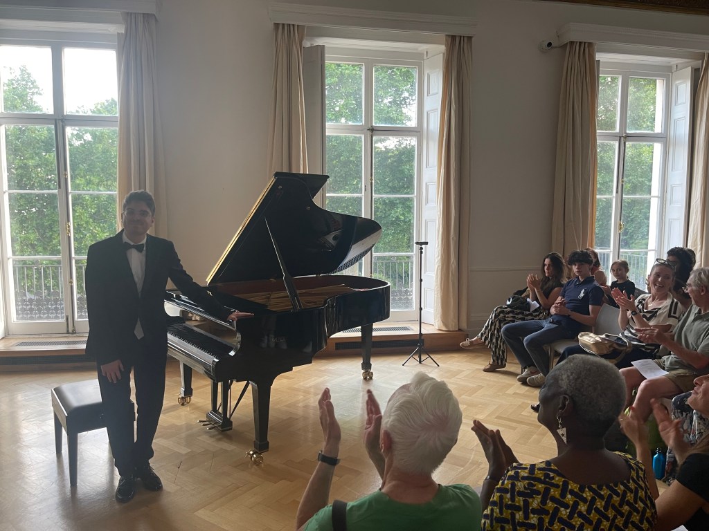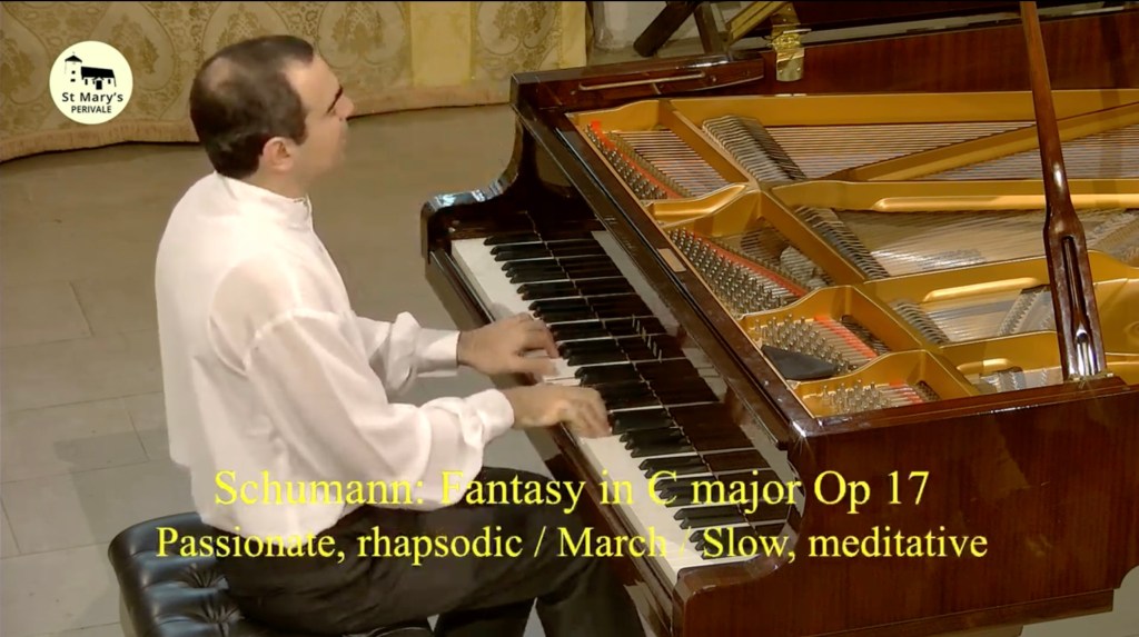 Schumann Fantasy was the second masterwork on the programme and is together with the Liszt Sonata the pinnacle of the romantic repertoire with Schumann and Liszt dedicating these works to each other. The opening was played with passion but also a mature control and a sense of line that was so clearly defined throughout. The ending ,a quote from Beethoven ,’To the distant beloved’, was played with disarming simplicity and remarkable tonal control. A beauty also in the central episode where the melodic line was allowed to float so magically over the hovering ever changing harmonies. The second movement was allowed to flow so naturally and Schumann’s dotted rhythms were shaped with poetic understanding where counterpoints glistened and glowed within this bubbling outpouring of radiance and beauty. There were some very interesting harmonies in the central melodic episode of great originality that Sandro highlighted with subtle poetic understanding. A beautiful transition from the virtuosity ending of this movement, where not only did Sandro play with enviable clarity but also giving a great sense of shape to a notoriously difficult coda. Timing the opening of the final movement to perfection and creating an atmosphere of the love and beauty that the composer wanted to share with his beloved Clara. A sense of fantasy and improvisation but also keeping a flowing tempo sustained by deep bass notes . A glorious luminosity to the two declamations of romantic fervour, never sacrificing absolute rhythmic precision as is rarely the case. Ravishing beauty to the final mellifluous outpouring as it built to a gentle climax only to die away to three magically placed final chords.