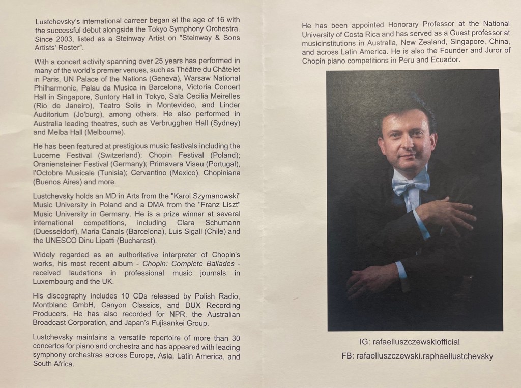 ‘Caro Sandro, congratulations!! While I haven’t been able to access the concert’s recording as yet, I have carefully read every word of Mr. Christopher Axworthy’s review; it brought tears to my eyes. What an acknowledgement of your extraordinary talent — your jaw-dropping technique and musicianship, and the breathtaking poetry of your interpretations. He even captured that magical touch of yours! As Jesus Garcia and I always say, you should be on the world’s stage!! Thank you, Mr. Axworthy, for writing a magnificent and well-deserved review of this extraordinary talent.’
