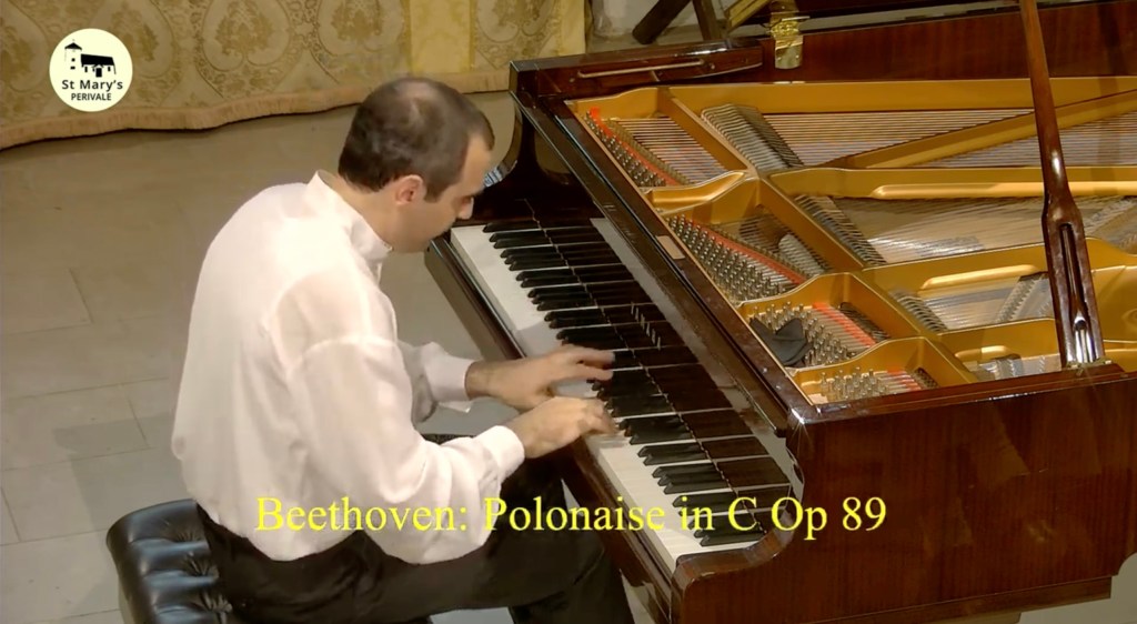 The Beethoven Polonaise, I do not think I have ever heard in concert before, and it is a charming work full of ‘joie de vivre’ and refined good taste. It was played with authority and a Beethovenian charm more allied to the world of Haydn than to the romantic school. It is interesting to note that it was written at the time of the Eighth symphony and the reworking of the opera Fidelio. It also precedes the equally beautifully simple Sonata op 90 and would seem to be a refreshing oasis for Beethoven before plunging into the depths of his final sonatas and Ninth symphony. Sandro played it with great style , knowing how to end with the flourish that the Polonaise demands even from Beethoven!