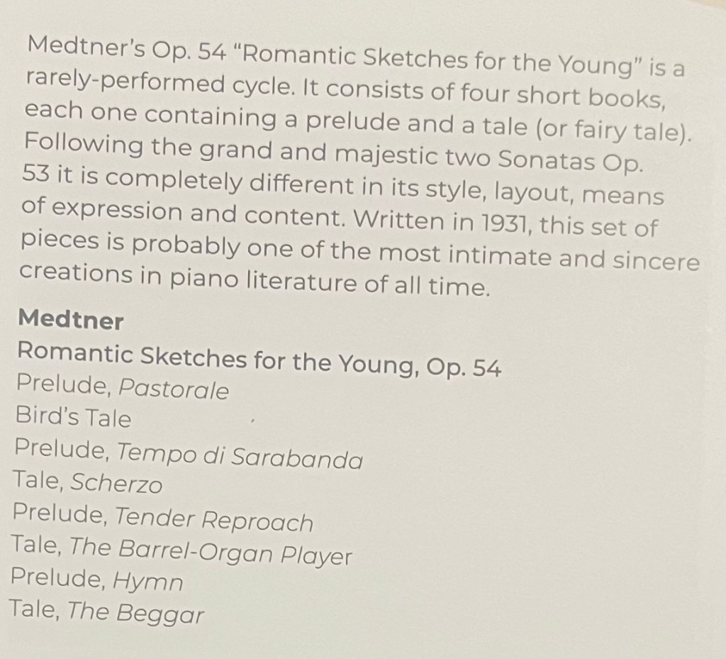 Dina Parakhina has long been an advocate of Medtner and it was inspiring to hear her magnificent playing of his Romantic ‘Sketches for the young’ op 54.