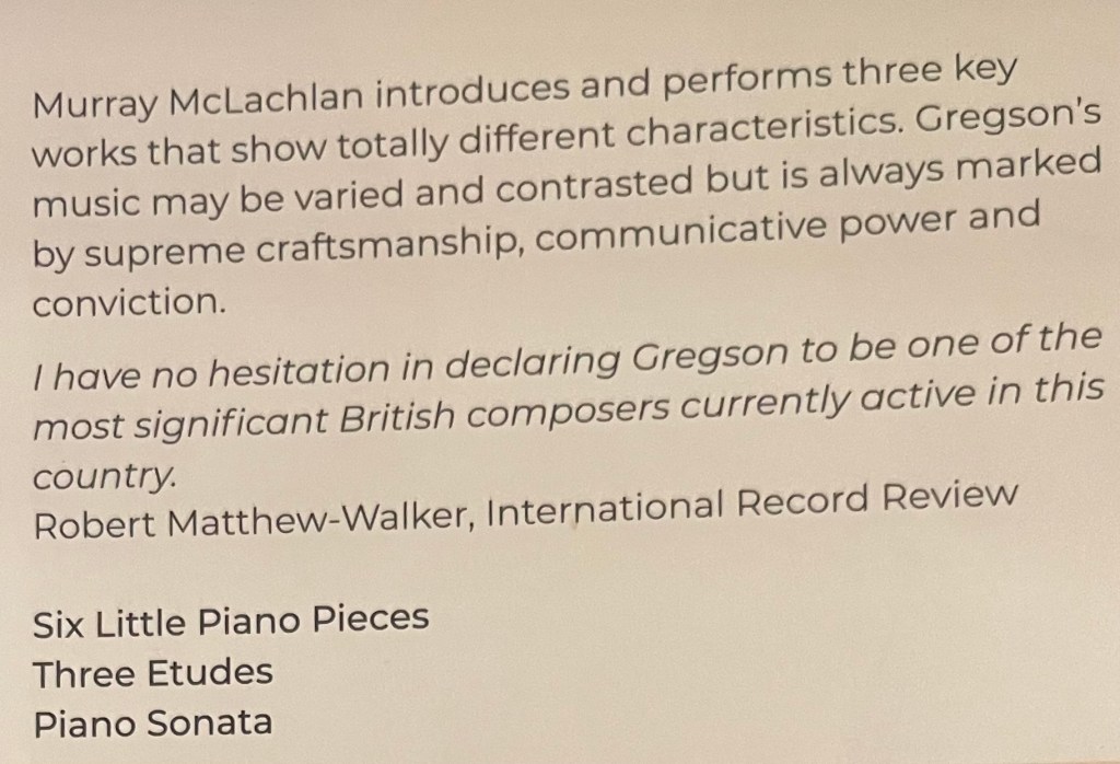 Another quite remarkable ‘tour de force’ from Murray Mc Lachlan with a recital dedicated to the work of Edward Gregson . Performances of transcendental command and authority that even the composer enthusiastically endorsed with his magnificent performance of his marathon Sonata.