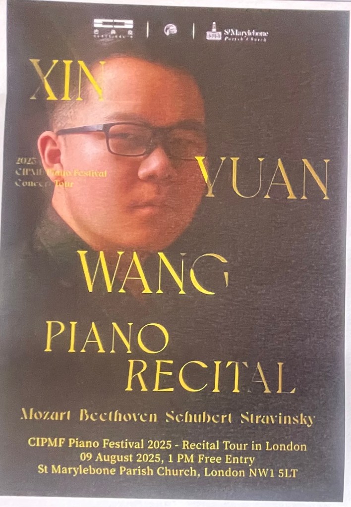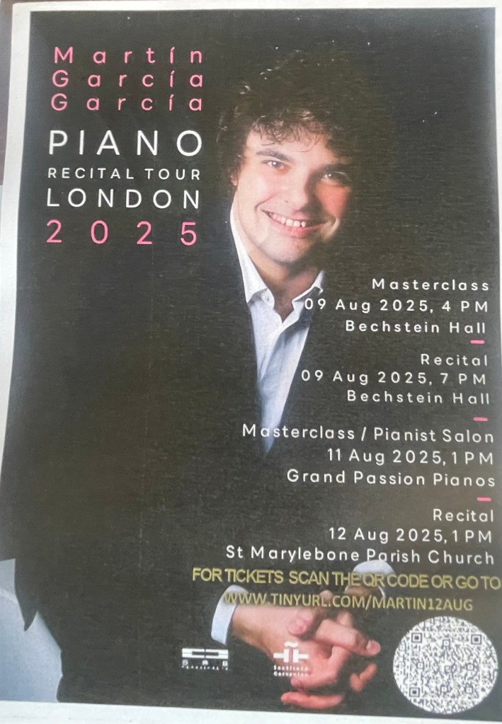 Tomorrow Xinyuan Wang , bronze prize winner at the Leeds in 2018, at 1 in St Marylebone Church opposite Madame Tussaud’s and at 7 Martin Garcia Garcia, prize winner in Warsaw, in the reborn Bechstein Hall – with a masterclass from 4 o clock onwards