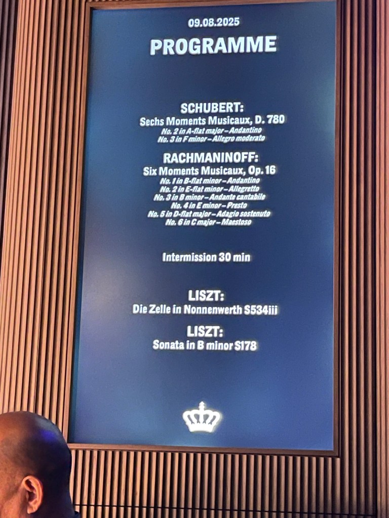 After a seamless Schubert Wanderer Fantasy, where none of the awkward joins were allowed to disturb the genial invention of a work that was to lead the way for all those that were to follow Schuberts all too short time on earth. A towering performance of Chopin’s study in C sharp minor op 25 n 7, that was like climbing a mountain to survey the world from on high, before returning to the ethereal beauty on earth. Liszt’s ‘Harmonies du Soir’ barely whispered opening with jewels that started to glisten and gleam in its midst until exploding into unimaginable passion .