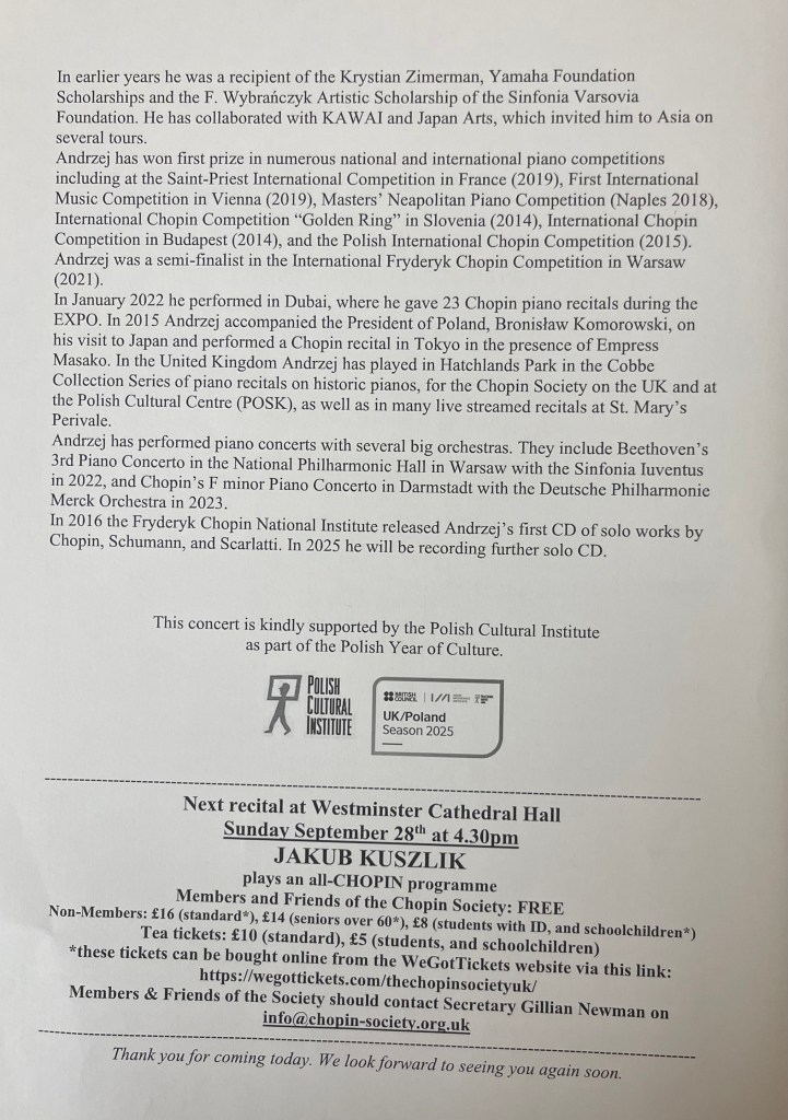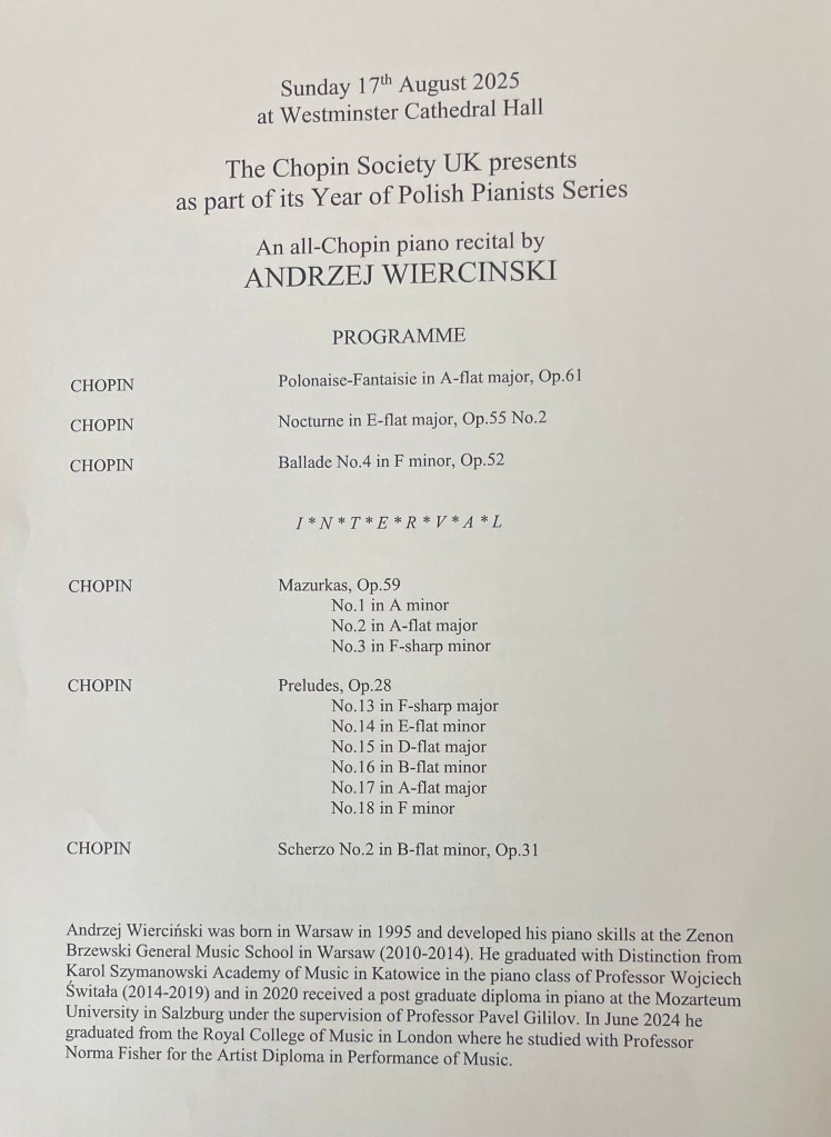 Today a special mid August concert for Andrzej Wierciński who will be participating at the competition in Warsaw in October. A surprisingly full hall in this holiday period as word must have spread that something special was to be heard in Westminster Hall .