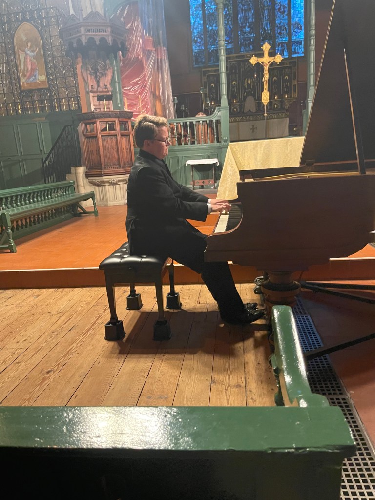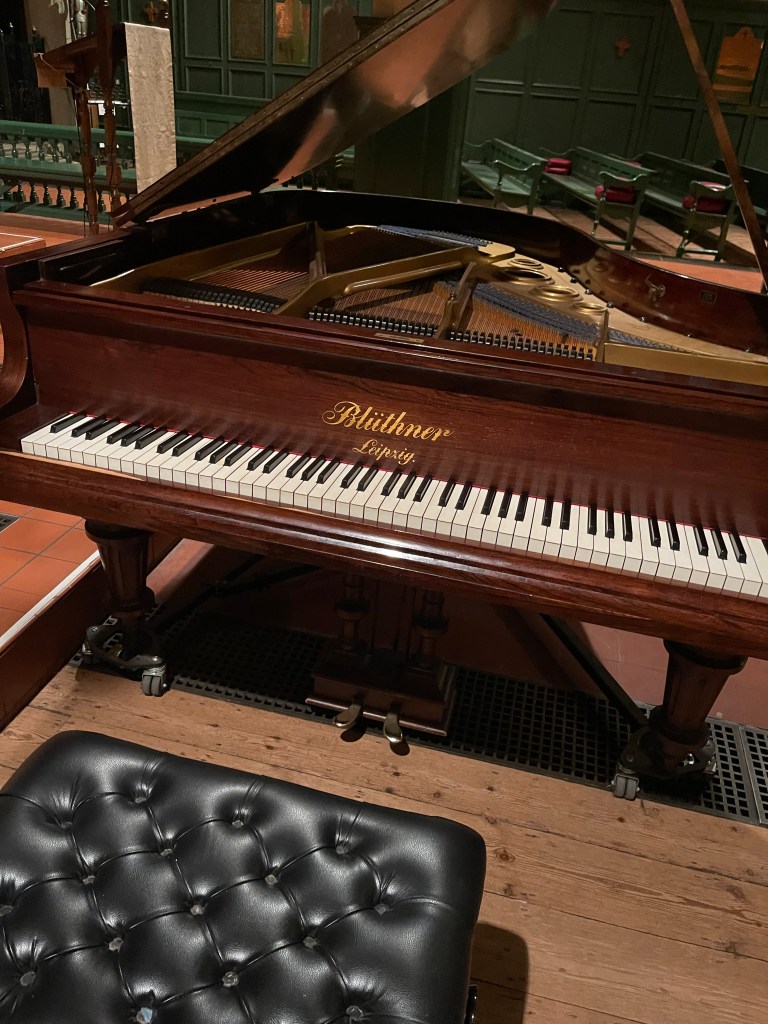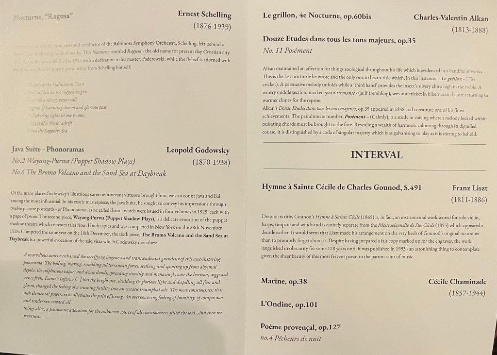 The highlight of the evening was Liszt’s ‘Hymne à Sainte Cécile de Charles Gounod’ S.491 a most beautiful paraphrase with an outpouring of melody of whispered beauty. Arabesques of radiant glowing lightness just accompanied a work that Liszt had forgotten about. As Mark tells us he had prepared the score for the printer but it was not published until 128 years later in 1993. In Mark’s words :’ an astonishing thing to contemplate given the sheer beauty of this most fervent paean to the patron saint of music’. It was played with mastery and superb musicianship and on this 1920 Bluthner with the dagherreotype sheen creating all the atmosphere necessary for the salons of the period.One was only surprised not to see Alkan or Liszt seated in the pews next to us.