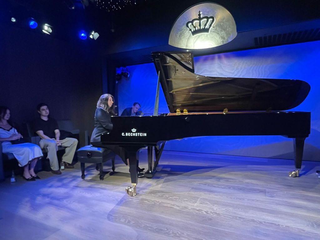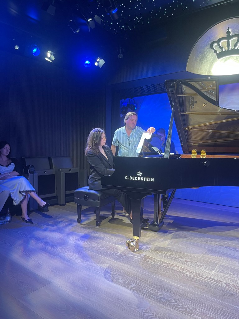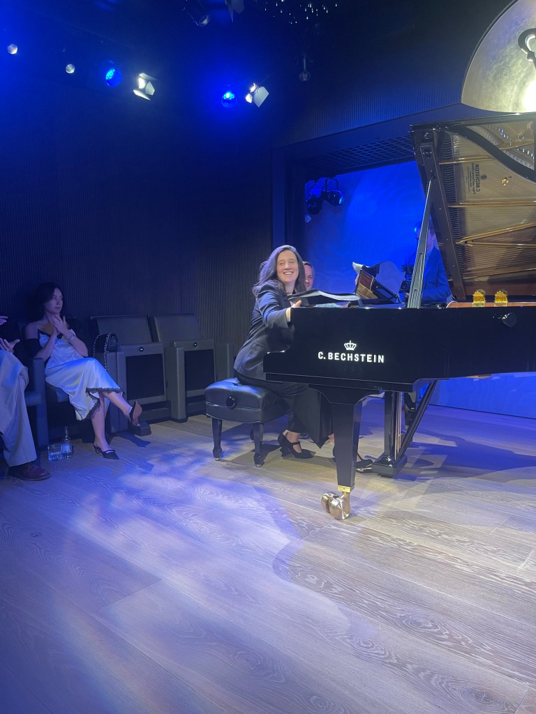 Ravel ‘Valses’ just poured from Evie’s hand and heart . ‘Nobles’ played with a freedom that would have had Perlemuter turning in his grave but that Evie played with such originality and a freedom that she saw from the very first Modéré played with heroic nobility. The same she was to find in the 7th and after the bubbling fun of the 6th leading eventually to the whispered magic of the ‘Epilogue’. It was here that Evie imbued the air with magic. Ravel remembering ,’avec un sentiment de regret’ a story that never ends but just drifts into oblivion. It was in this atmosphere that the bubbling cauldron of red-hot passion was allowed to explode with breathtaking decadence. This was a world in which Evie entered with fearless abandon of double glissandi and much else, filling this magnificent Bechstein with sounds it has never known before. The sumptuous night club atmosphere of this very intimate hall just added to the overwhelming emotions that were being banded about before our very eyes.