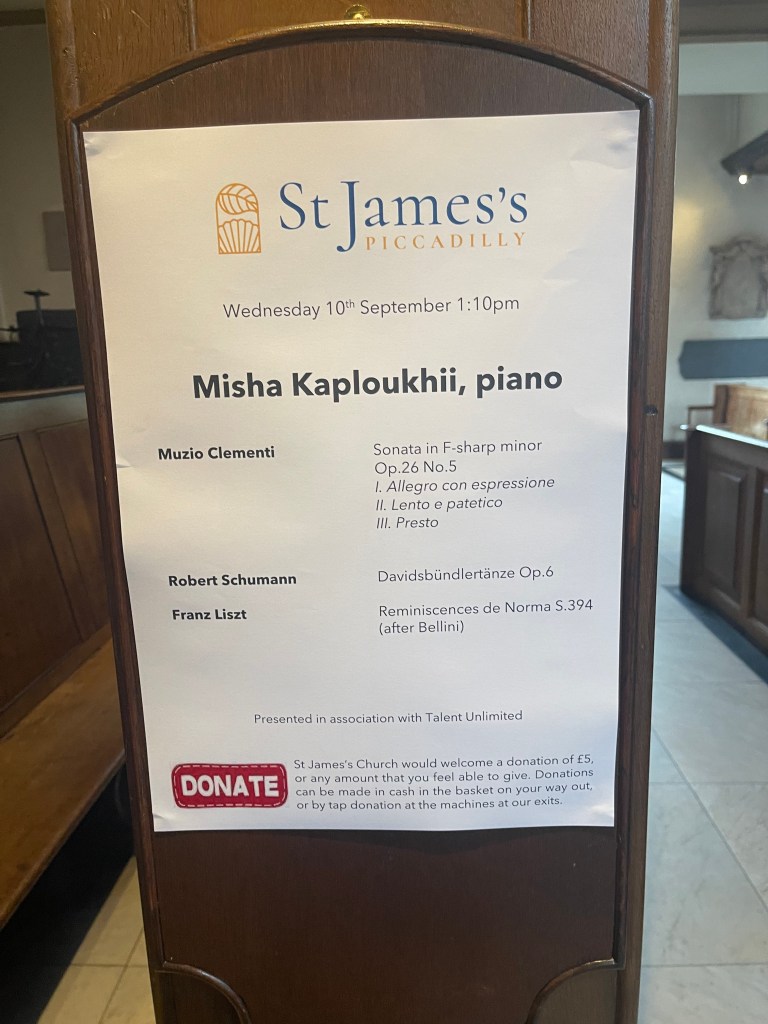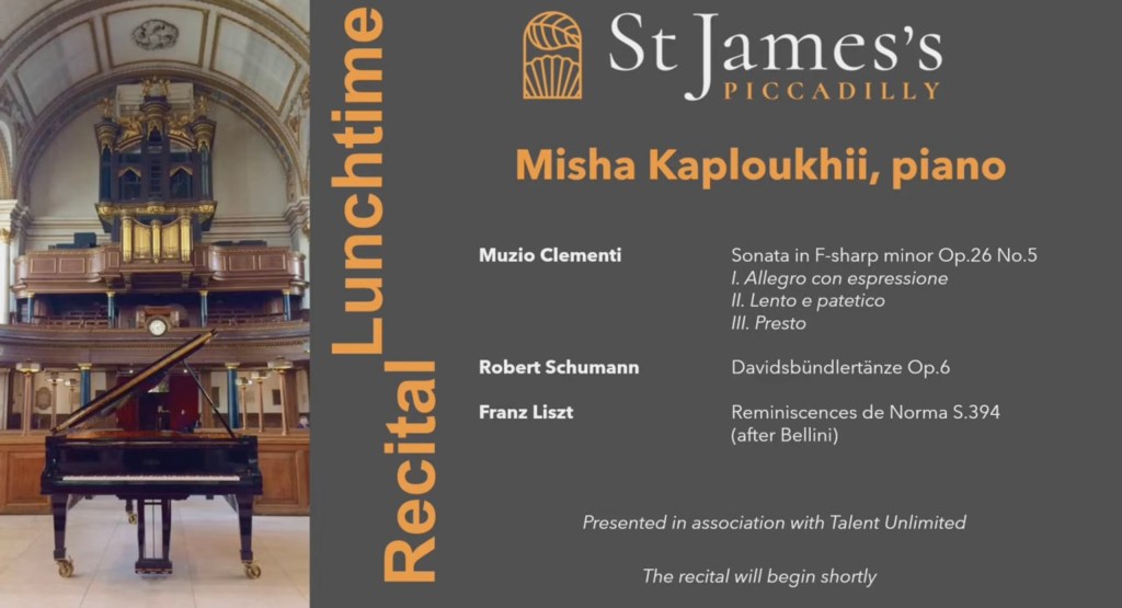 Misha Kaploukhii at St James’s Piccadilly with the stylistic beauty and refined brilliance of Clementi and the supreme fantasy world of Schumann’s magical Davidsbündler .