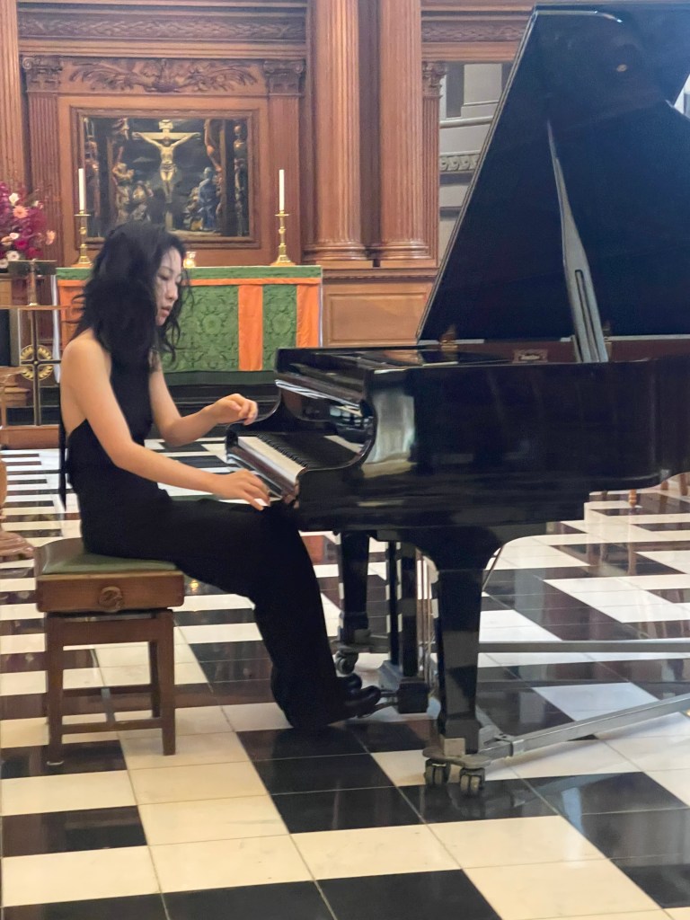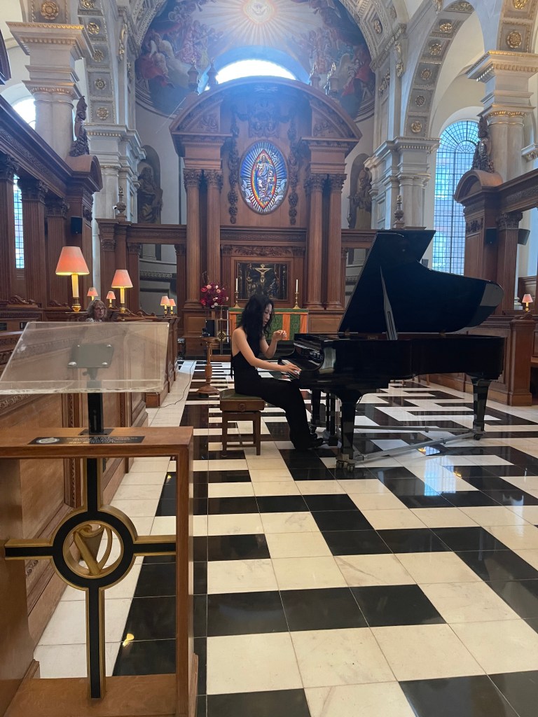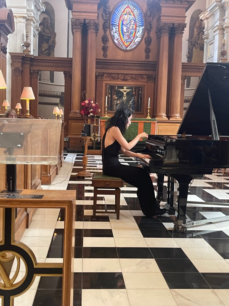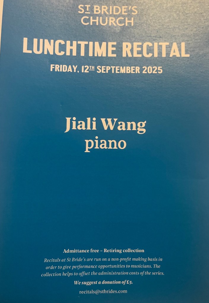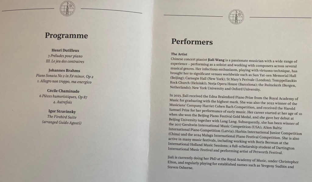 Playing of great authority and mastery at St Brides today. Brahms that filled this beautiful church with sumptuous orchestral sounds as Jiali threw herself into this challenging opening movement of the Second Sonata with fearless abandon . A nobility of Lisztian bravura dissolving into intimate deeply felt poignant beauty before exploding again with breathtaking authority and dynamic drive . It was a pity to be robbed of the other movements but with limited time Jiali wanted to treat us also to the extraordinary sound world of Dutilleux and Stravinsky.