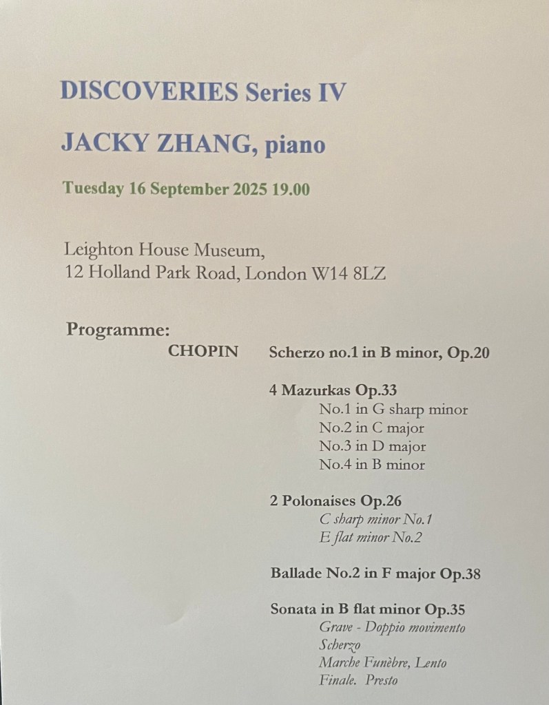 Jacky Zhang at Leighton House and Chopin fever is upon us.