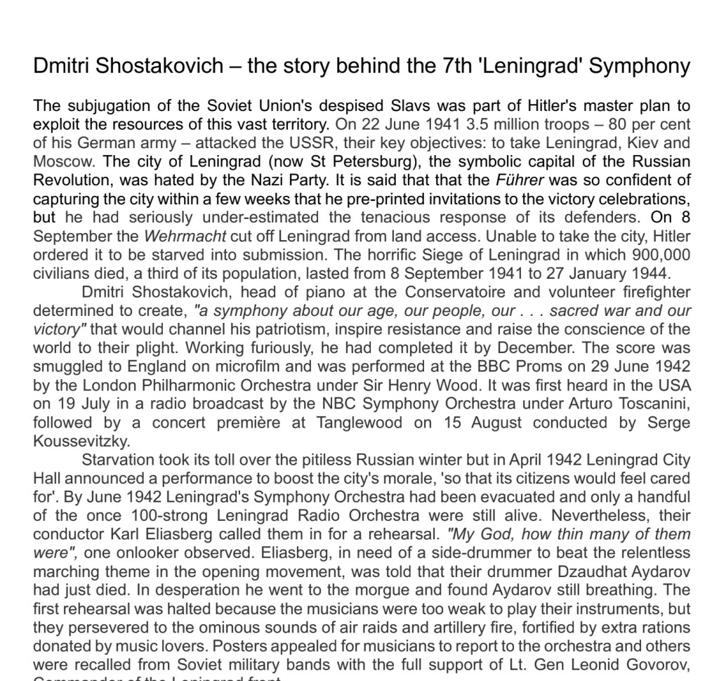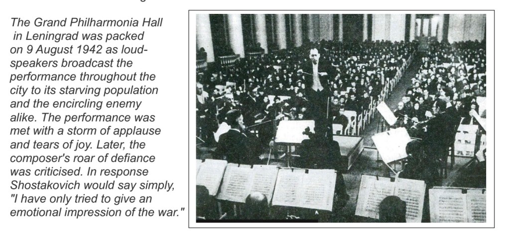 A Symphony on its first performance in 1942 playing to a population starved and encircled by Hitler. A story of defiance and courage and a performance in the Grand Philharmonic Hall also broadcast live to the whole of the USSR , via Radio Leningrad, that was met by applause and tears of joy.