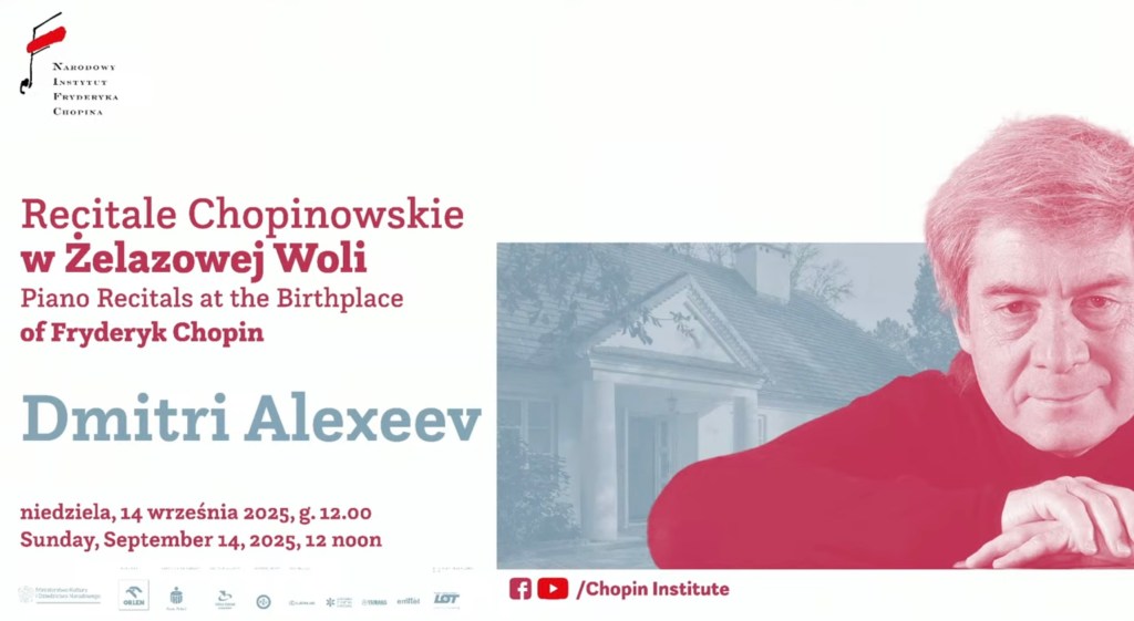 https://www.youtube.com/live/N2XkdoA_M8E?si=5eRYxNw0eeKROYc0Sunday Chopin Recitals in Żelazowa Wola are a series of open-air concerts held at the Birthplace of Fryderyk Chopin from May to September. They continue the long-term tradition initiated by Professor Zbigniew Drzewiecki, an eminent Polish pianist and teacher, in 1954. The recitals are an extraordinary opportunity to listen to performances by outstanding Polish and foreign pianists, professors of world renown, and winners of the International Chopin Competitions. September 14 2025 Dmitri Alexeev Programme: Fryderyk Chopin Nocturnes in F-sharp minor, Op. 48, No. 2 in E major, Op. 62, No. 2 in C-sharp minor, Op. 27, No. 1 Impromptu no. 3 in G-flat major, Op. 51 Trois Nouvelles Études, Dbop. 36 No. 1 in F minor No. 2 in A-flat major No. 3 in D-flat major Ferenc Liszt Polish Songs, S. 480 (based on Polish Songs, Op. 74 by F. Chopin) A Maiden’s Wish My Darling The Bridegroom’s Return