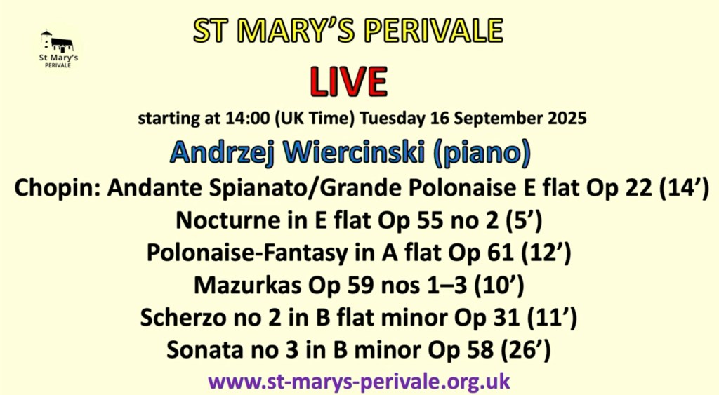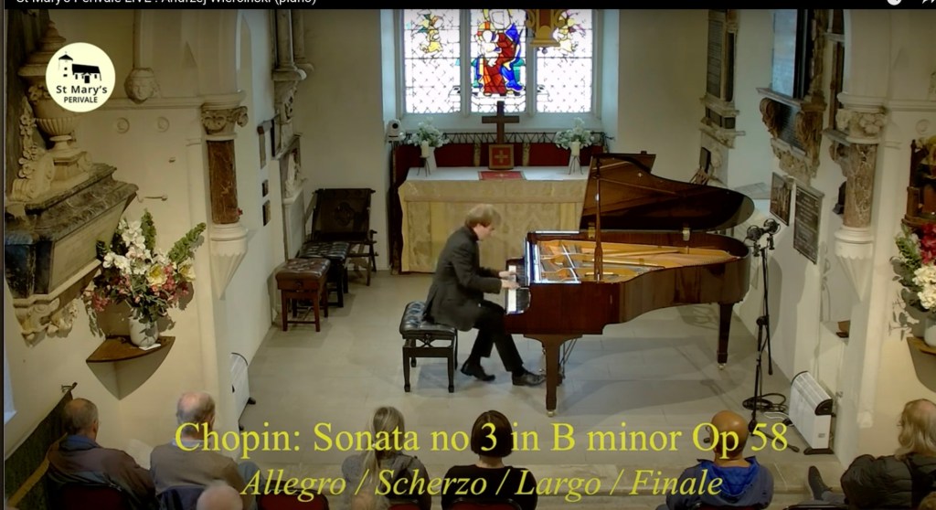 I have heard all of these works over the years from Andrzej, from the ecstatic outpouring of the Nocturne op 55 to the mellow imposing beauty of the Polonaise Fantaisie op 61 with Andrzej’s wonderful way of painting the sounds at the beginning like an artist before his canvas, where sounds and visual beauty live in close harmony. The radiance and luminosity of the Mazurkas op 59 and the imposing energy of the Scherzo in B flat minor with the poignant beauty of the central episode that gradually bursts into scintillating brilliance .Exceptionally today there was a short interval before Andrzej played the B minor Sonata . When Andrzej returned he was like a man possessed. One of the miracles of live performance is as Gilels said, like fresh food as opposed to the processed food of recordings . An audience can stimulate a real artist into embarking on a voyage of discovery where even he is taken to places he had never imagined before . Today was just such a case with the opening of the Sonata played with searing authority and dynamic drive . An architectural shape and a timelessness where even the second subject was sung with strength and delicacy. A development episode that was of imposing aristocratic authority . A scherzo of such perfect legato that was like streams of undulating sounds reaching a central episode that was played with deeply felt poignancy . The imposing introduction to the slow movement was even linked to the final chords of the scherzo as the ravishing bel canto was allowed to breathe with delicacy and ravishing beauty, but also a sense of direction and shape that was quite extraordinary . A final movement played with authority and breathtaking mastery as it built with aristocratic control to the final explosion of scintillating brilliance .Even the encore of the waltz in E flat was played with the charm and ‘joie de vivre’ of a pianist from another age . The Golden Age to which Andrzej on this showing today is a true heir.