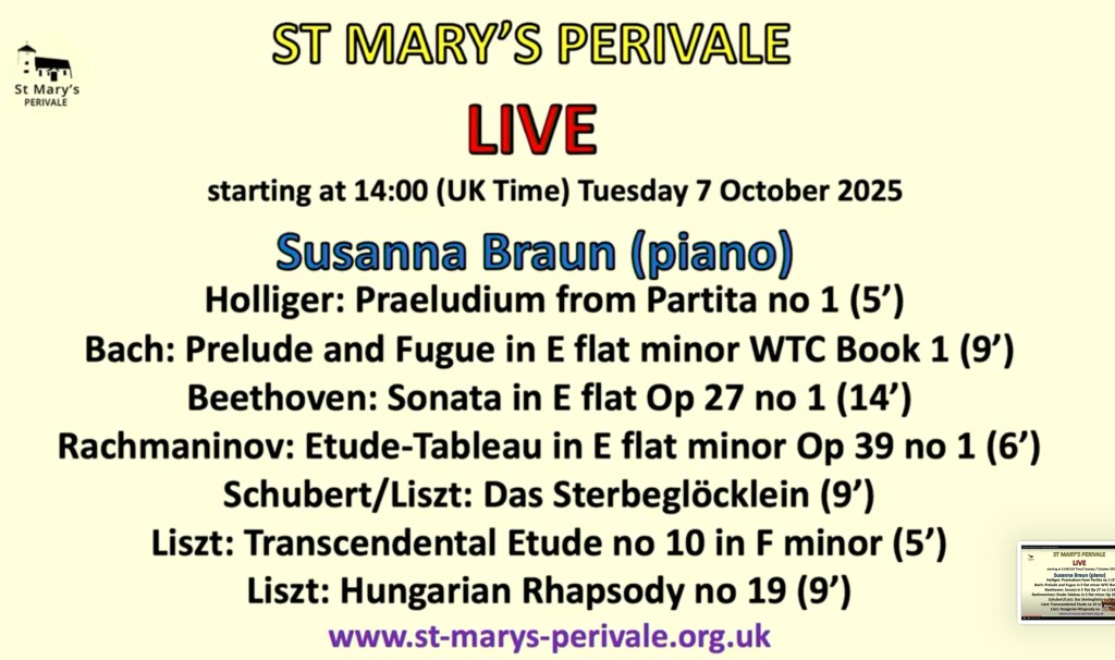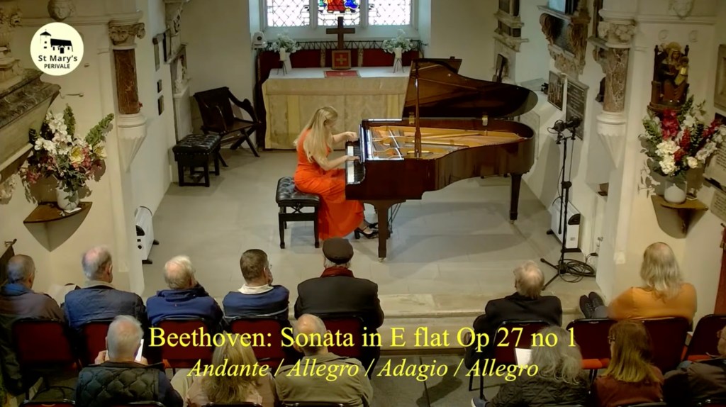 Many are tuned in to the Chopin Competition live stream in Warsaw where many pianists are in the running who have been promoted by Dr Mather. We should not forget that the indomitable St Mary’s are continuing, non stop, to give a platform to young artists with three concerts or more every week, also live streamed to an audience worldwide. I managed to hear this brilliant young Swiss pianist on play back and thank God I did ! Superb playing of the clarity and precision of a baroque keyboard player but with the colour and sumptuous sounds of a superb pianist too. Strange curled fingers like ten little hammers, necessary for playing antique instruments, but rather unnatural for the piano with pedals . Chopin was the first to show us that the scale of D flat was for starters not C major, with a hand that caressed the keys and extracted the sound like limpets sucking the lifeblood from each note. But this young Swiss pianist is also a formidable musician with a passionate heart. She is also very knowledgable and able to choose a stimulating programme where the final cluster of Holliger on E flat was the sound out of which emerged the Bach prelude from book one. A Beethoven sonata op 27 but not the ‘Moonlight’ but its sister less often played but still a Sonata ‘quasi Fantasia’ as Beethoven announced. A transcription of a Schubert song that was new to me but was transformed into a magical tone poem by Franz Liszt. The Nineteenth Hungarian Rhapsody was also new to me and what a discovery with the same Hungarian inspired virtuosity and sense of beguiling dance but with that strange late world that was beginning to open up a whole new vision for the future by the genial Abbé Liszt . It was the encore of Scarlatti that gave the game away with Susanna’s obvious baroque training such was the clarity and drive but also the ornamentation that she discreetly added to such a scintillating sonata.
