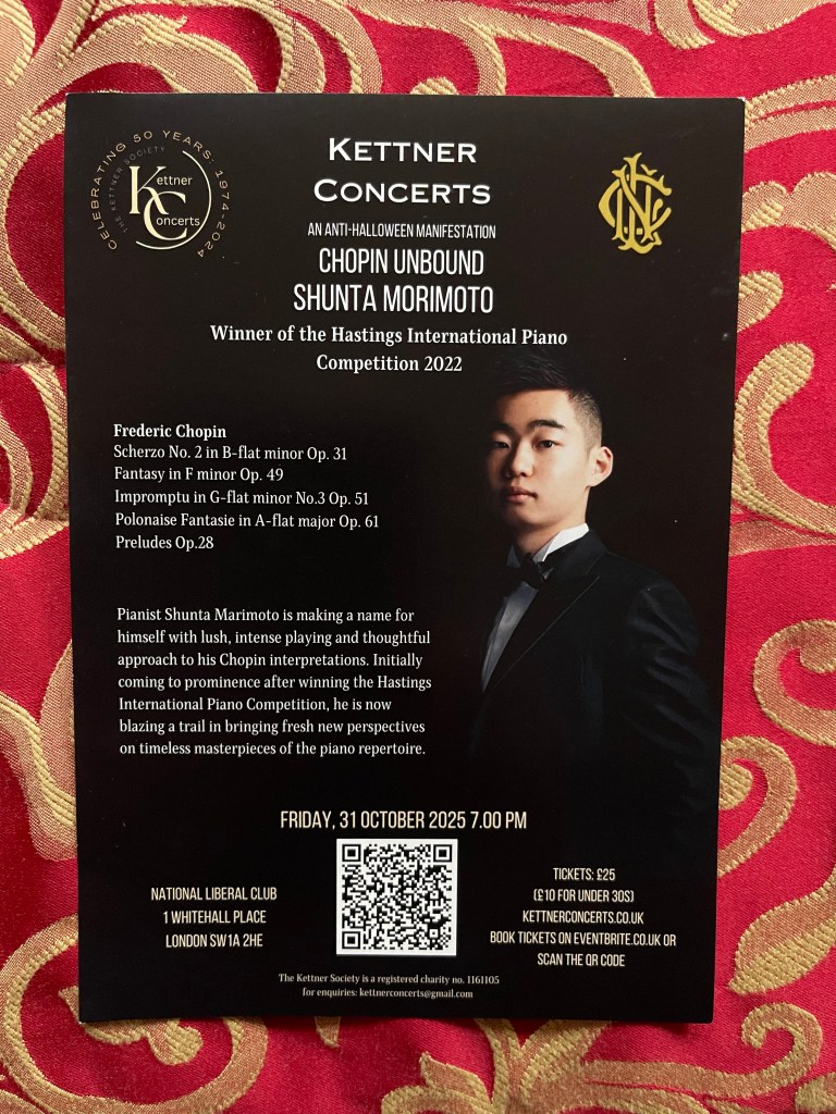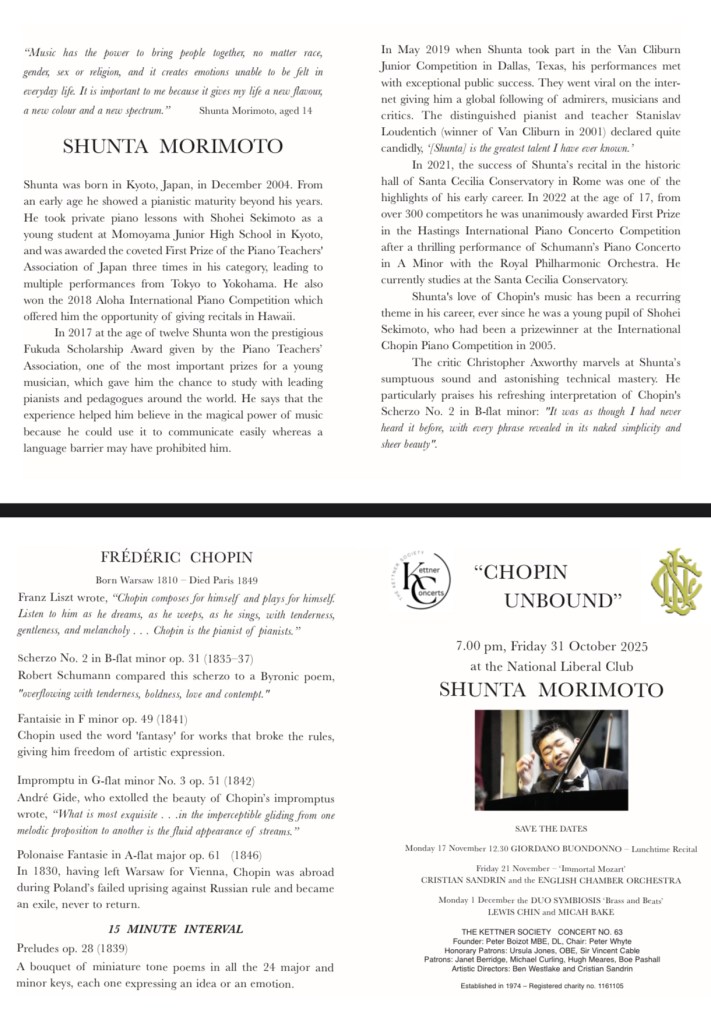 From the very first notes we were were immediately immersed into a world of drama, fantasy and passionate involvement . The Scherzo in B flat minor was played with an extraordinary range of dynamics which seemed almost like hearing it for the first time. And yet everything was written in the score for those ,like Shunta, who can delve deeply. The ‘sostenuto’ was of whispered beauty ‘sotto voce’ and was played with a stillness and a wondrous sense of discovery. Building to an overwhelming climax that was fearless and breathtaking for its audacity and total conviction.