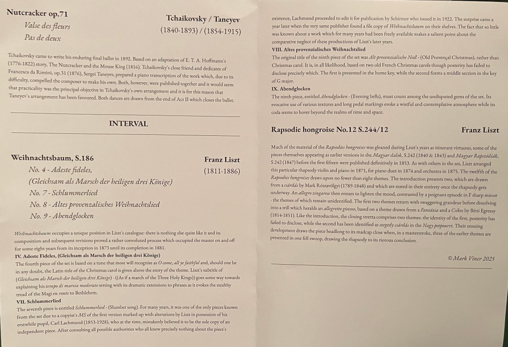 More extraordinary playing from Mark Viner as his latest CD dedicated to Alkan receives accolades fit only for a Prince of the Keyboard. With typical modesty, dedication and not a little hardship Mark continues his voyage of discovery bringing us performances of mastery and extraordinary scholarship that are being celebrated regularly with every one of his many CD’s as they are issued. His is not the popular repertoire that draws the crowds but for us that think we know all there is of the piano repertoire he puts us to shame with discoveries of works by forgotten masters. Names that adorn the history books with stories of reclusive virtuosi crushed by the Talmud or of duels in Parisian salons between adored favourite virtuosi. Rarely has this music been brought to life by performances of mastery and scholarship such as Mark is showing us, with a continual stream of musical discoveries. But it is not only the forgotten masterpieces that he plays with authority and mastery but he brings the same microscopic seriousness to well worn classics where rhetoric and tradition have taken us far from what the composer actually bequeathed to posterity in the score. Today Mark chose to open and close with two well worn masterpieces by Mozart and Liszt and in-between to show us not the usual Pletnev concert transcription of Tchaikovsky but that of the composer’s friend Taneyev . Together with a series of miniatures ,one by Rebikov that Cherkassky used to play as an encore ( which he would announce to me in the wings of his concerts in Rome ) and some rare miniatures written for Liszt’s granddaughter Daniela von Bulow as a Christmas present. She had accompanied her grandfather to Rome due to his frail condition and the first performance was on Christmas Day 1881 in Daniela’s Rome hotel suite. This was the day on which her mother Cosima always celebrated her birthday, although she was actually born on Christmas Eve.