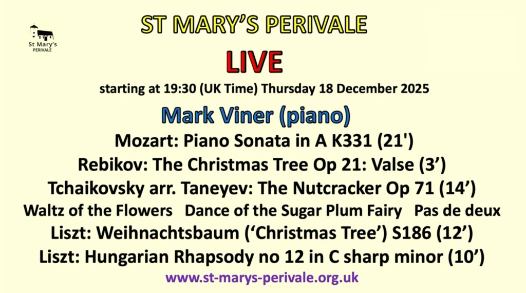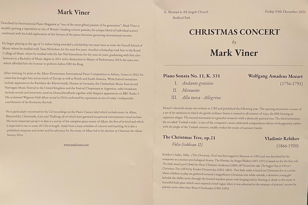 Mark’s annual Christmas concert arriving in London with the final two performance at St Mary’s Perivale for his dear friend and admirer Dr Mather and in the church of St Michael and All Angels, opposite his home in Bedford Park, where he also is an active member of the congregation.