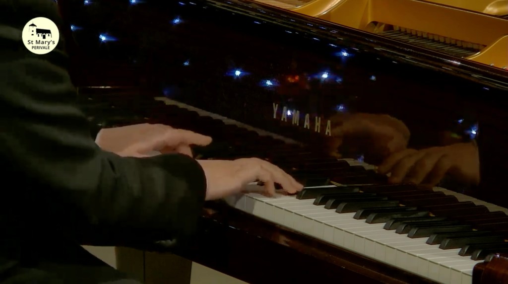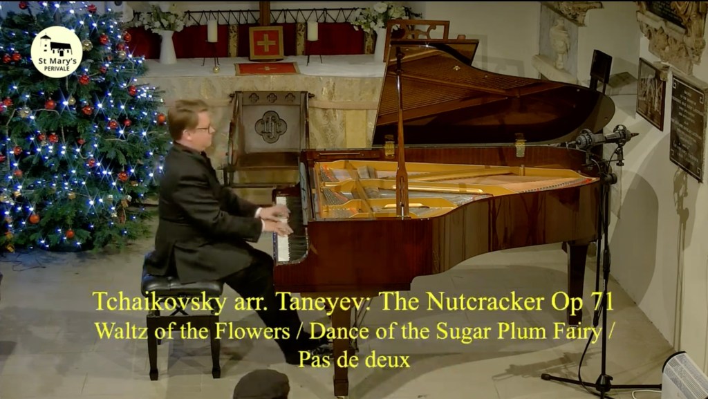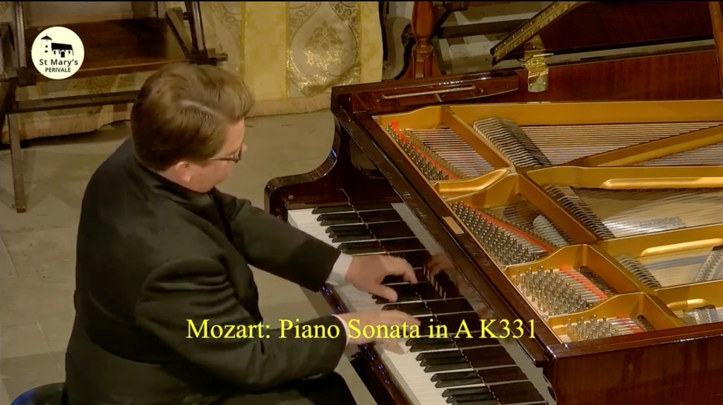 Mark’s Mozart is of a crystalline clarity and a chiselled beauty respectful of it’s time and imbued with an attention to detail of phrasing adding pedal only enhancing the beauty and simplicity with which he allowed the music to unfold with jewel like brilliance. There was a beautiful legato to the third of the opening variations with octaves that were allowed to sing with glowing beauty. A ‘joie de vivre’ of exhilaration as the clarion bells rang out in the fourth before the poignant beauty of the Adagio of the sixth.Charm and radiance rang out in the final variation with the final two chords played without any rhetoric but thrown off with a simple ‘that’s all’. A simplicity and beauty with scrupulous attention to Mozart’s indications but that did not exclude the poetic beauty that a true artist could find within then notes. Repeats too scrupulously respected and relished. There was a question and answer to the ‘Menuetto’ with it’s pompous opening statement answered with a heartrending reply before the mellifluous outpouring of the ‘Trio’ played with operatic participation.He brought a stately brilliance to the Rondò ‘Alla Turca’ with its very discreet echo effect always understated rather than underlined which had so much more effect than the more exaggerated performances that we are usually subjected to. As Mark says in his admirably short but exhaustive notes:’ vivid pageantry,replete with the jangle of the Turkish crescent ,readily evoking the music of janissary bands’. Mark brought the charm and beauty of the Golden age of piano playing to Rebikov’s Valse from his Christmas Tree Ballet op 21. Playing of another age when Levitski, Moiseiwitch, De Pachmann