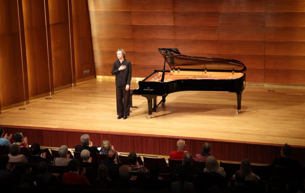 Mikhail managed to recreate Beethoven’s ‘Appassionata’ Sonata where his sensitivity and fantasy were linked inextricably to the great architectural line that Beethoven constructs. A palette of sounds all within the first few bars with the rests speaking louder than the notes. Gradually a dynamic drive of continual contrasts becoming more and more urgent. A beautifully lyrical second subject bursting into a scintillating output of energy where Beethoven’s markings were scrupulously observed and imbued with passionate intensity. The ‘Andante con moto’ was played with full rich sound of string quartet quality as this cortège wound its way inexorably forward. Adding more notes with each of the variations that Mikhail played with great beauty and clarity until the final whispered chord that was to explode into the ‘Allegro ma non troppo- Finale . A movement played with a continual forward drive and masterly control as a continuous web of notes was played with whispered weavings contrasting with explosions of passionate drive. The coda was the culmination of this movement of exhilaration and excitement and as the temperature rose Mikhail managed to keep masterly control but with breathtaking intensity. This was a remarkable performance in which Mikhail managed to combine a classical interpretation with style and imagination that brought this great work vividly to life.