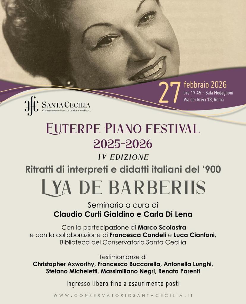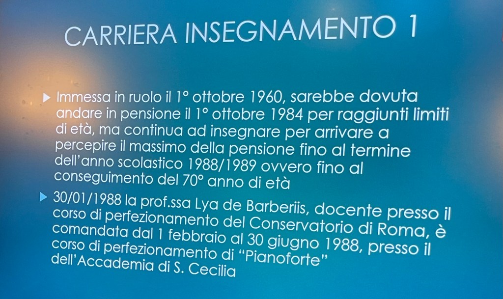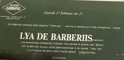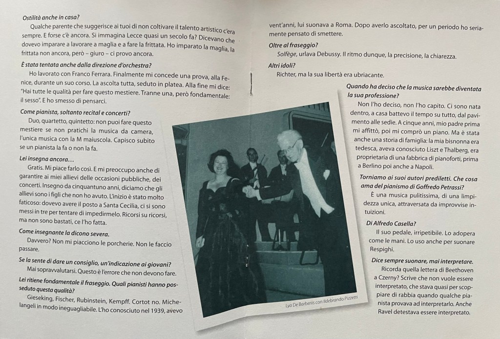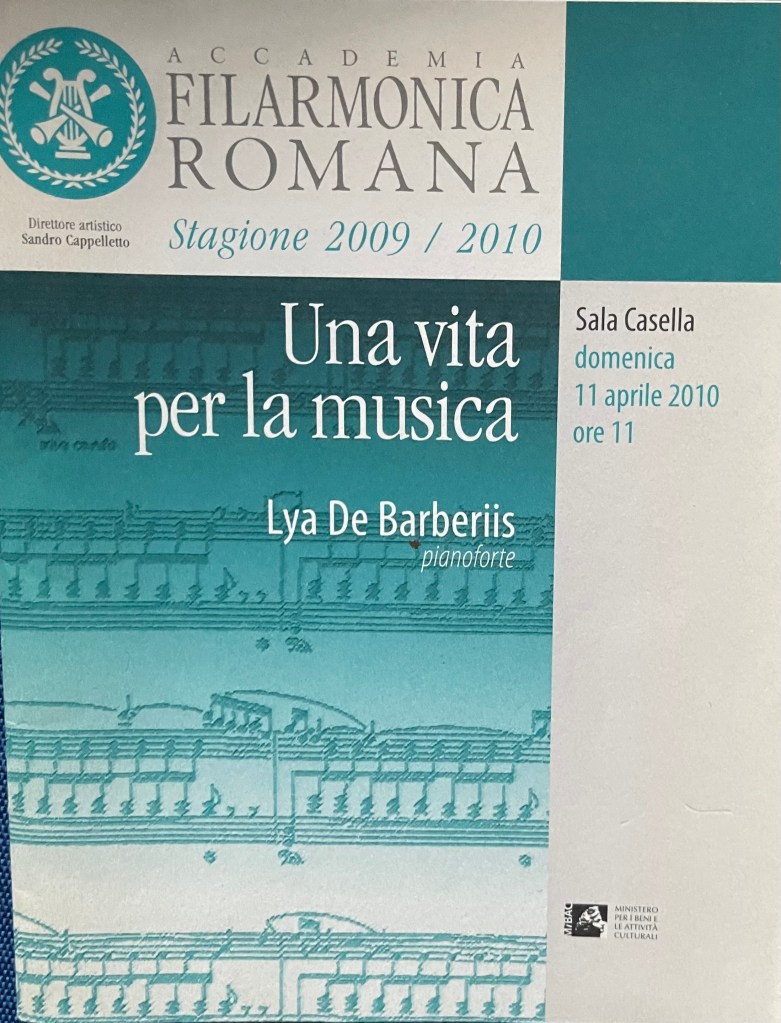 Lya De Barberiis, a celebration of a great, much loved pianist who above all was a musician, a humble servant always at the service of the composer . An important figure for so many people for her warmth and humanity but above all for her strong personality which helped to shape and inform so many lives as we were reminded today. Everyone came armed with a story to tell about this remarkable woman who was such a dominant force in our lives. Her integrity, honesty and total dedication to music was an example to us all. A warmth from a woman who never ceased to learn, as she would come often with her students to worship at the feet of Guido Agosti as she would Rosalyn Tureck who she discovered in 1991 in ‘our’ theatre. ‘Ours’ because Lya so admired this Cultural Centre of Excellence that my wife and I had created in the 80’s and 90’s that she frequented not only to discover many great musicians who had been neglected in Rome but that she would join playing in duo with Ruggiero Ricci or giving many important solo recitals ( including the Beethoven Trilogy). Agosti would often be in the audience as would Arrigo Tassinari (Toscanini’s first flute ) who lived next door.