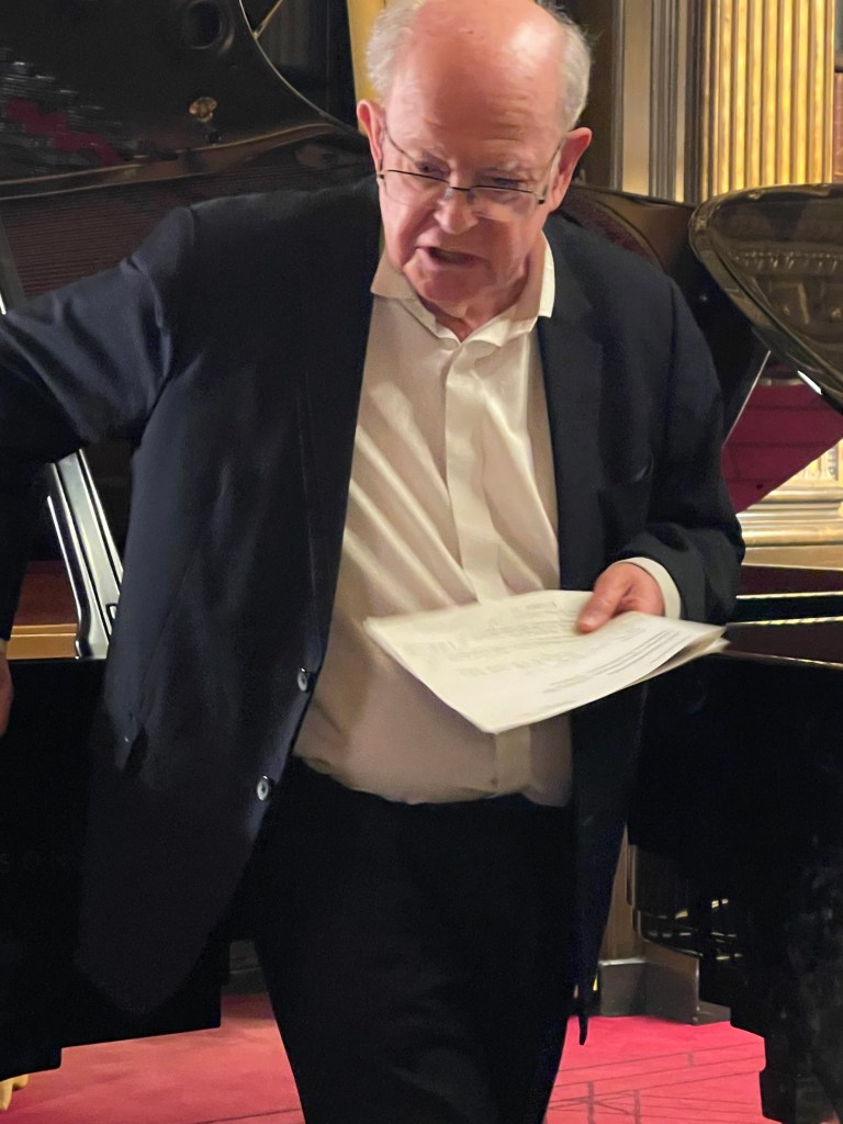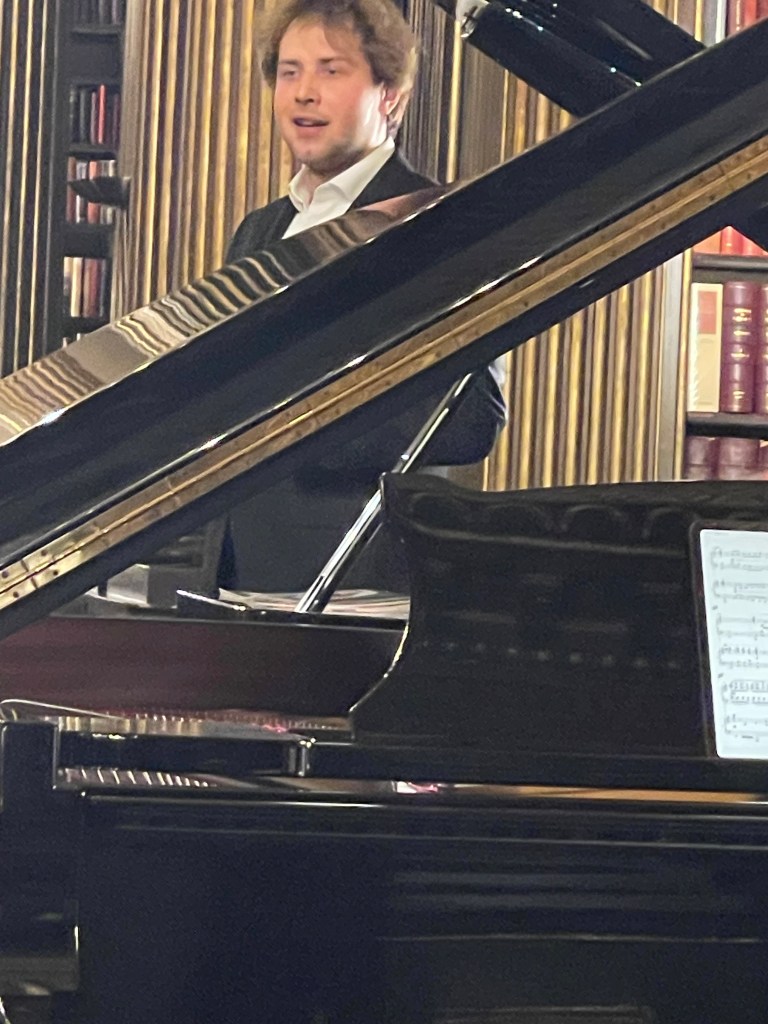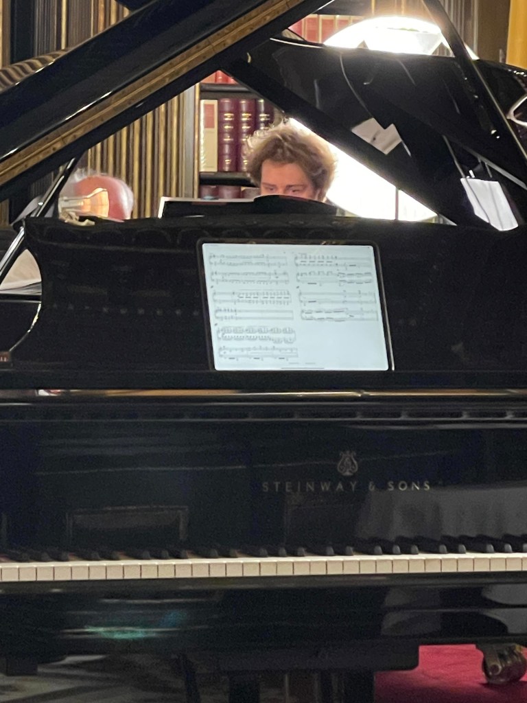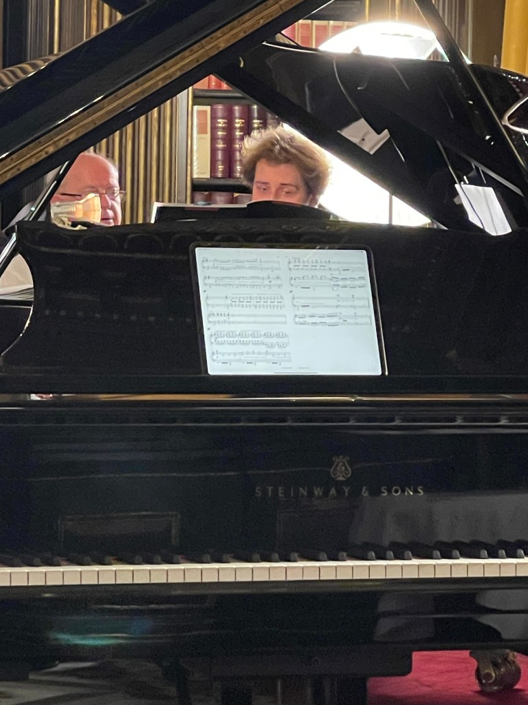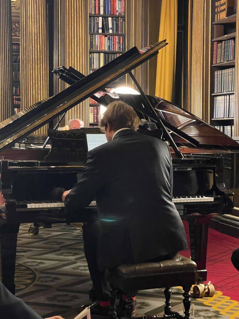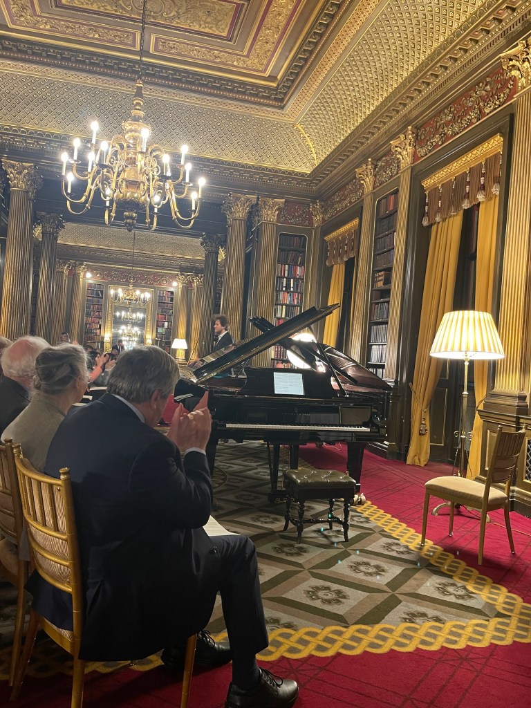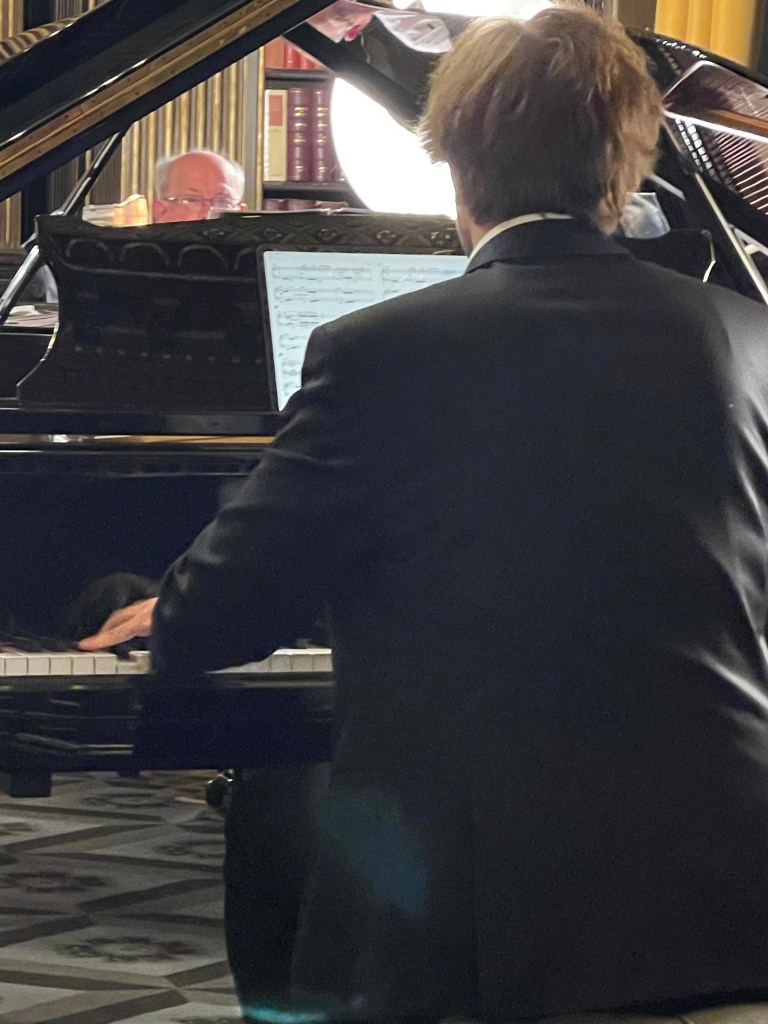 Today he could let his hair down with scintillating performance for two pianos of Saint- Saëns, Shostakovich, Mussorgsky and ending with Tchaikowsky’s ‘Nutcracker’. Enticed into playing less serious fare by Michael Corby ,at the helm of two magnificent Steinway ‘D’ pianos that stand proudly in the ‘Golden’ library at the Reform Club.