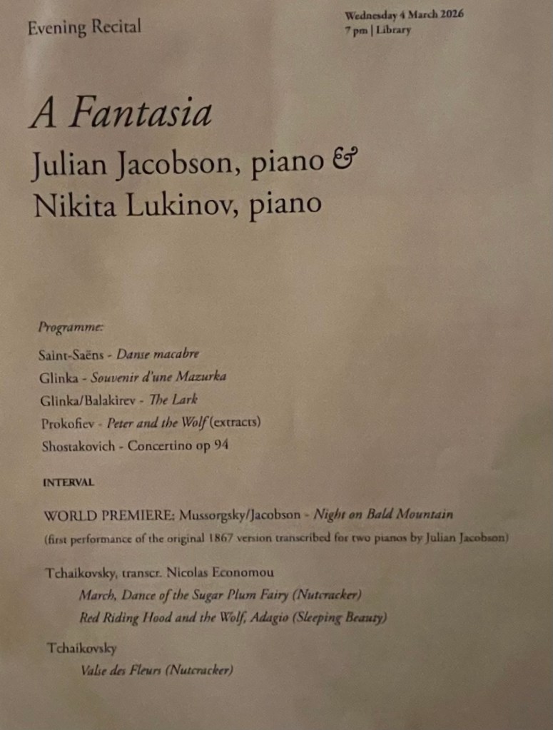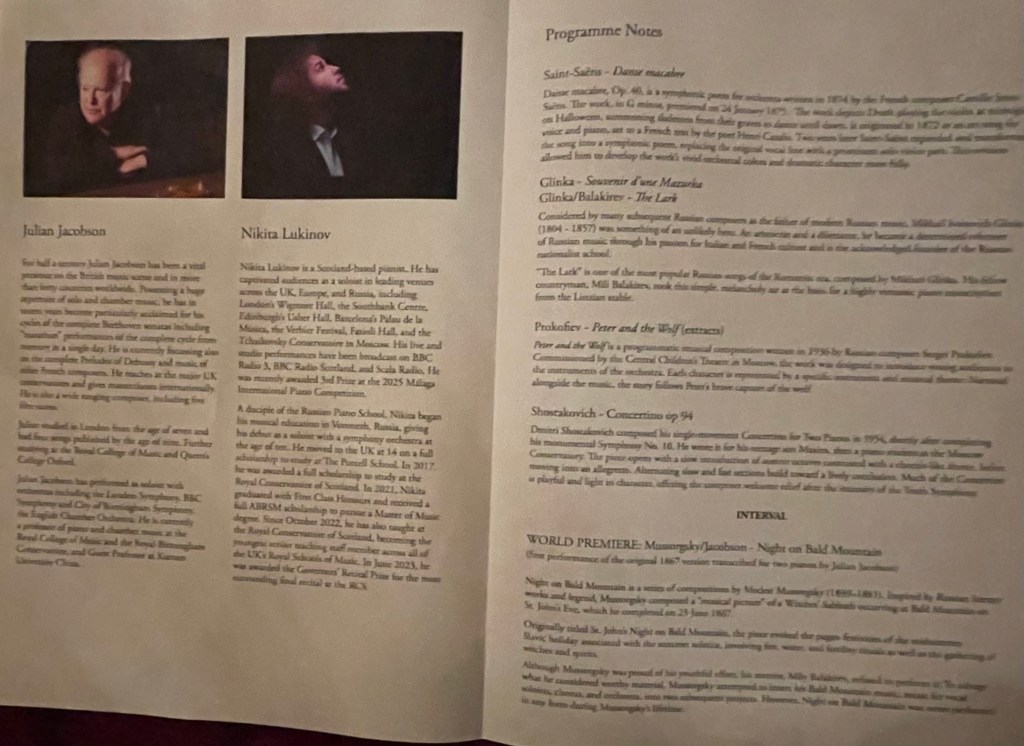 A fascinating concert devised by the eclectic Professor Jacobson, who also happens to be a virtuoso pianist as is Nikita Lukinov. A star shining brightly in an overcrowded sky, Nikita has long included in his solo programmes his own arrangement of Mussorgsky’s elusive early ‘Bald Mountain’, It is a youthful work that from an early age had haunted Mussorgsky and which he never actually heard performed, in any form, in his lifetime. It has also haunted Julian who wrote his arrangement for two pianos to play with Andrew Ball, the much missed head of piano at the Royal College of Music. https://christopheraxworthymusiccommentary.com/2023/02/14/a-celebration-of-the-life-of-andrew-ball-the-thinker-pianist-at-the-r-c-m-london/