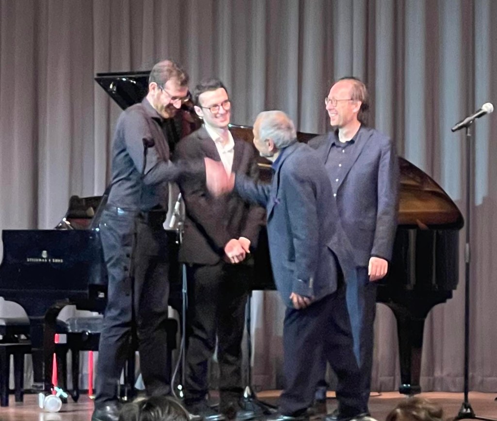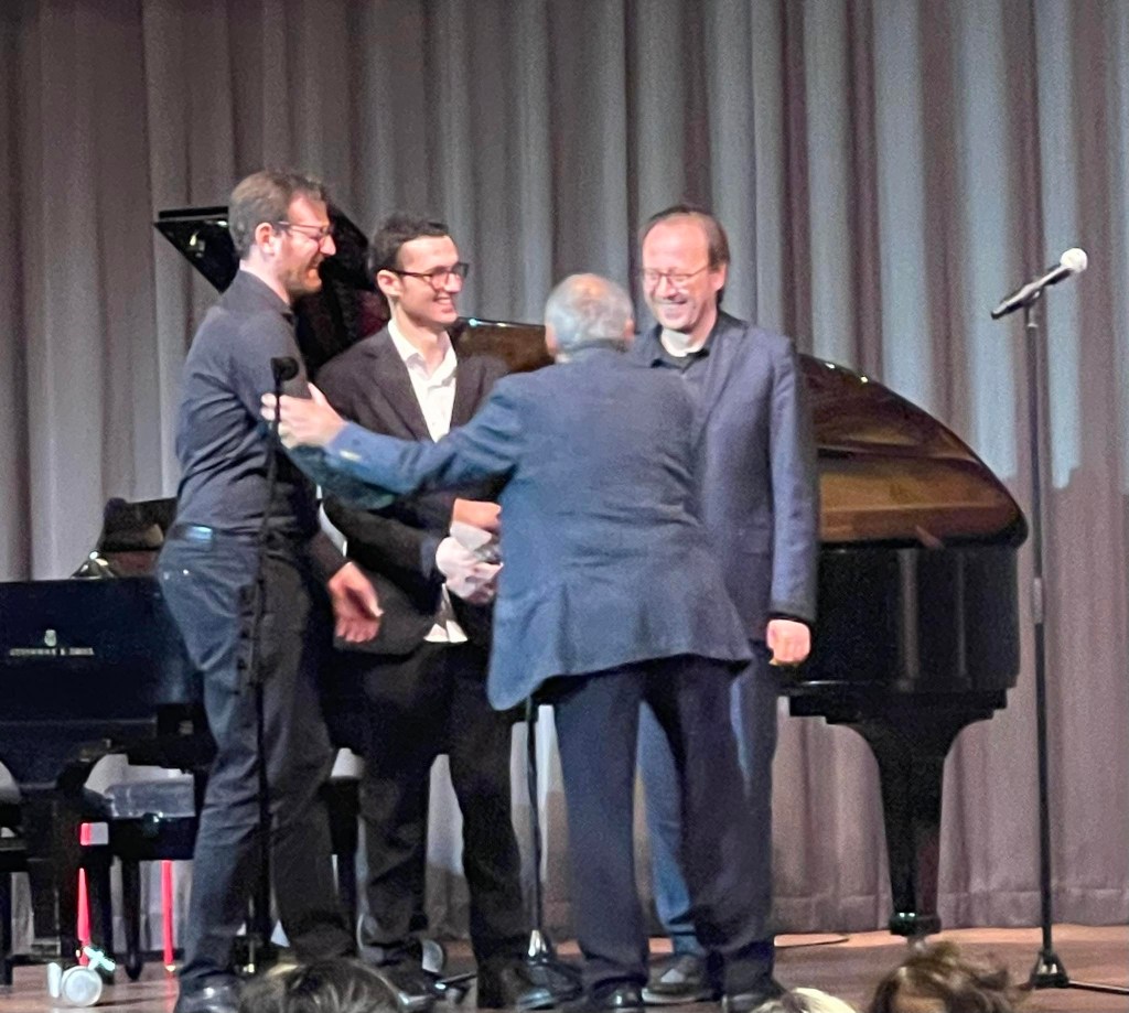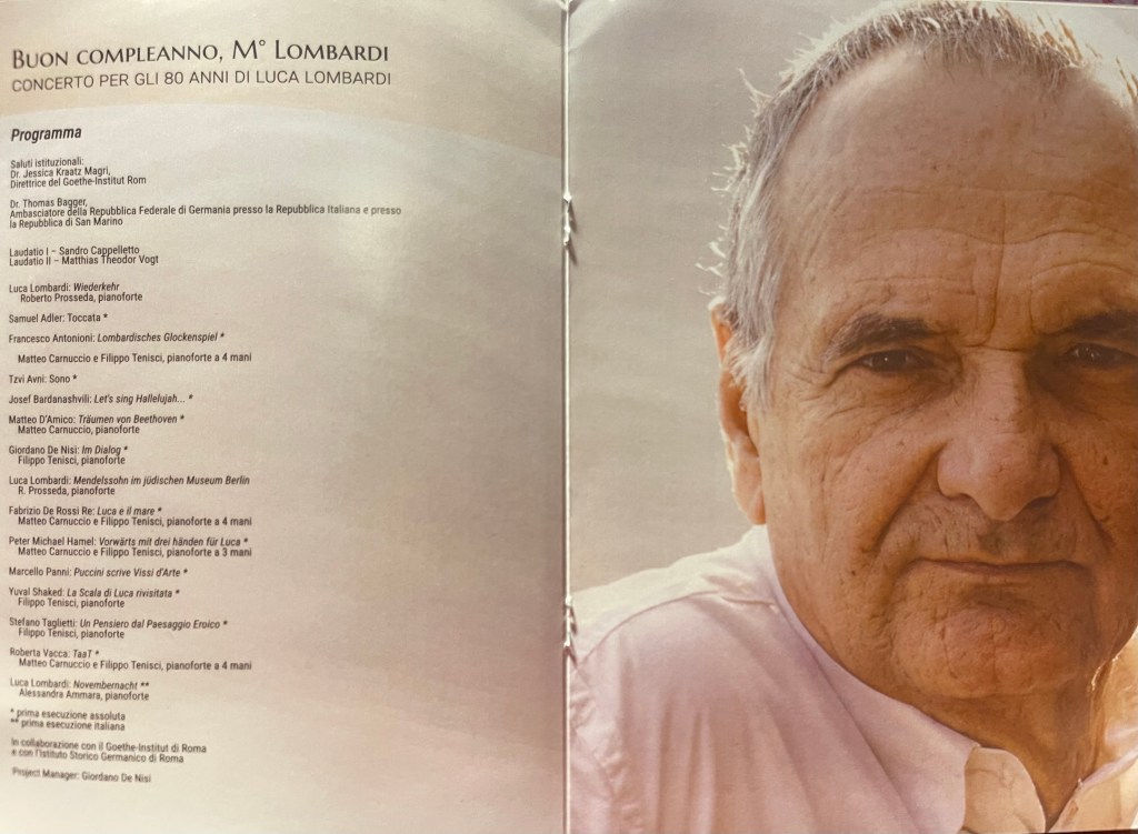 The concert featured Roberto Prosseda, performing some piano compositions by Luca Lombardi, flanked by two young emerging pianists Matteo Carnuccio and Filippo Tenisci, entrusted with the premiere of numerous musical tributes written especially for the occasion by composers from different countries: Samuel Adler, Francesco Antonioni, Tzvi Avni, Josef Bardanashvili, Matteo D’Amico, Giordano De Nisi, Fabrizio De Rossi Re, Peter Michael Hamel, Marcello Panni, Yuval Shaked, Stefano Taglietti, Roberta Vacca.