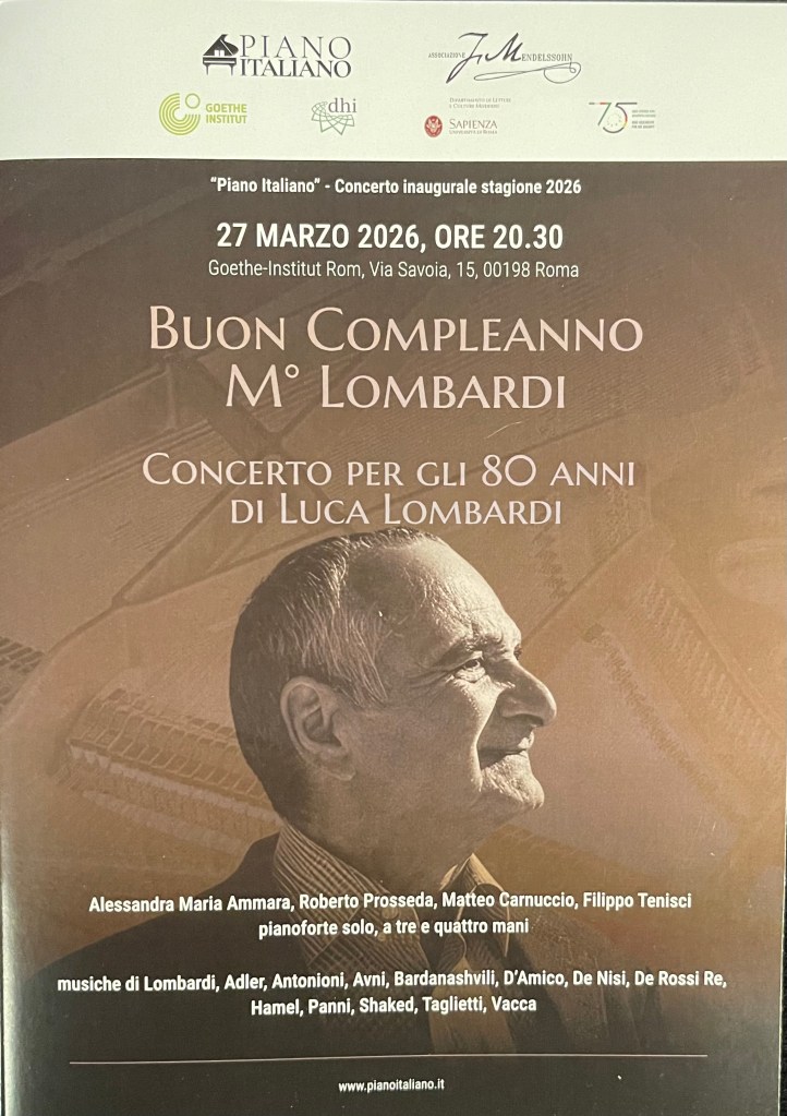 At the end of the concert, on March 27 and 28 there was a conference “Quo vadis, commitment? Trends and ideas of music from the 60s to today” – A symposium in honour of Luca Lombardi’s eightieth birthday. This is a project realised in collaboration between the German Historical Institute of Rome, the Seminary of Musicology of the University of Heidelberg, the “La Sapienza” University of Rome and the Goethe-Institut of Rome.The concert of March 27 also was the official opening of the “Piano Italiano” 2026 festival, organised by the Mendelssohn Association, under the artistic direction of Roberto Prosseda.